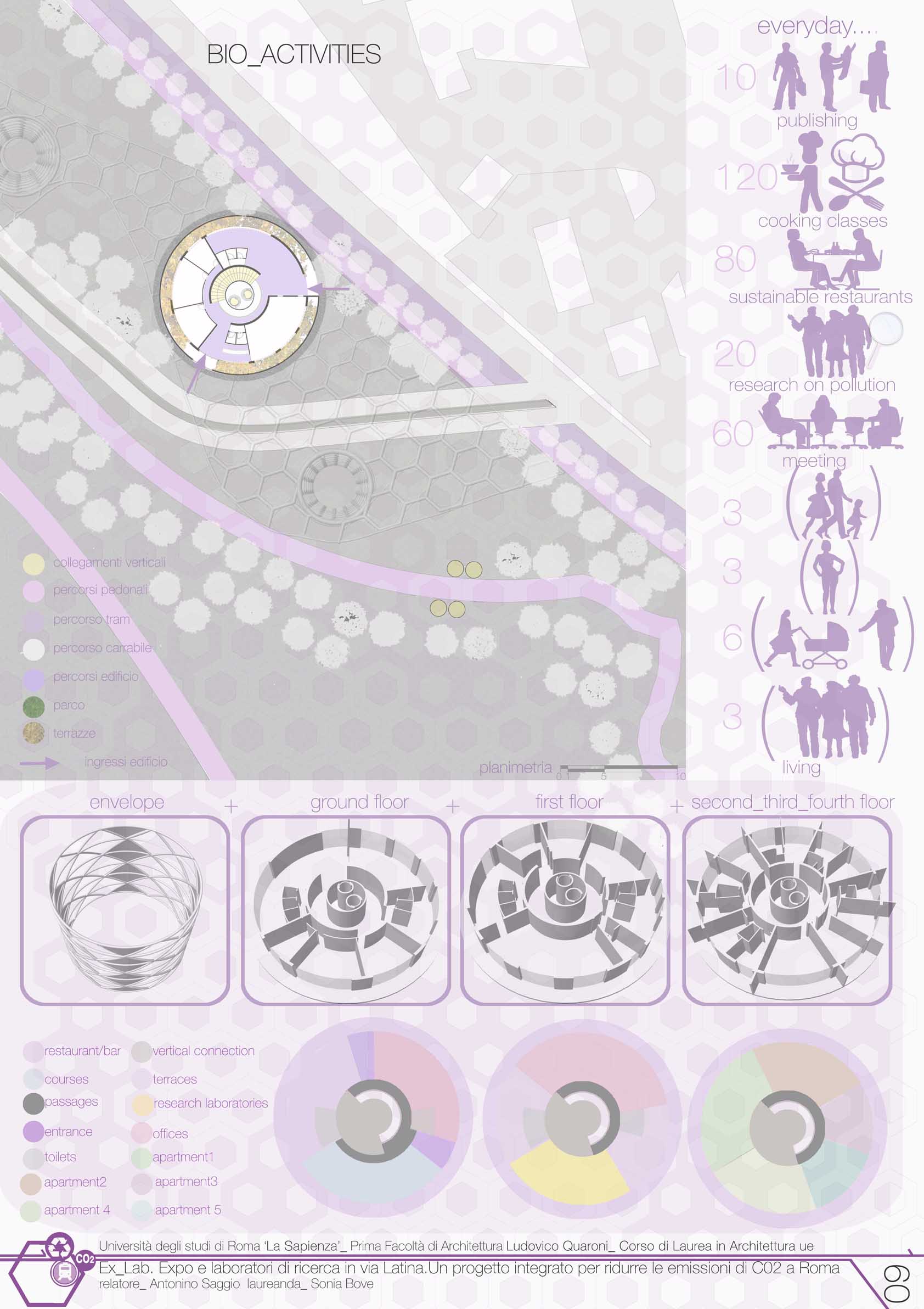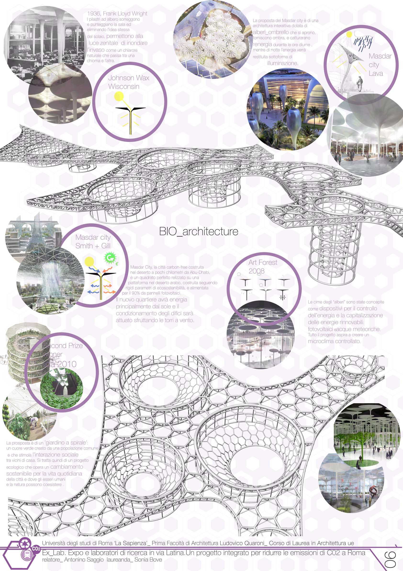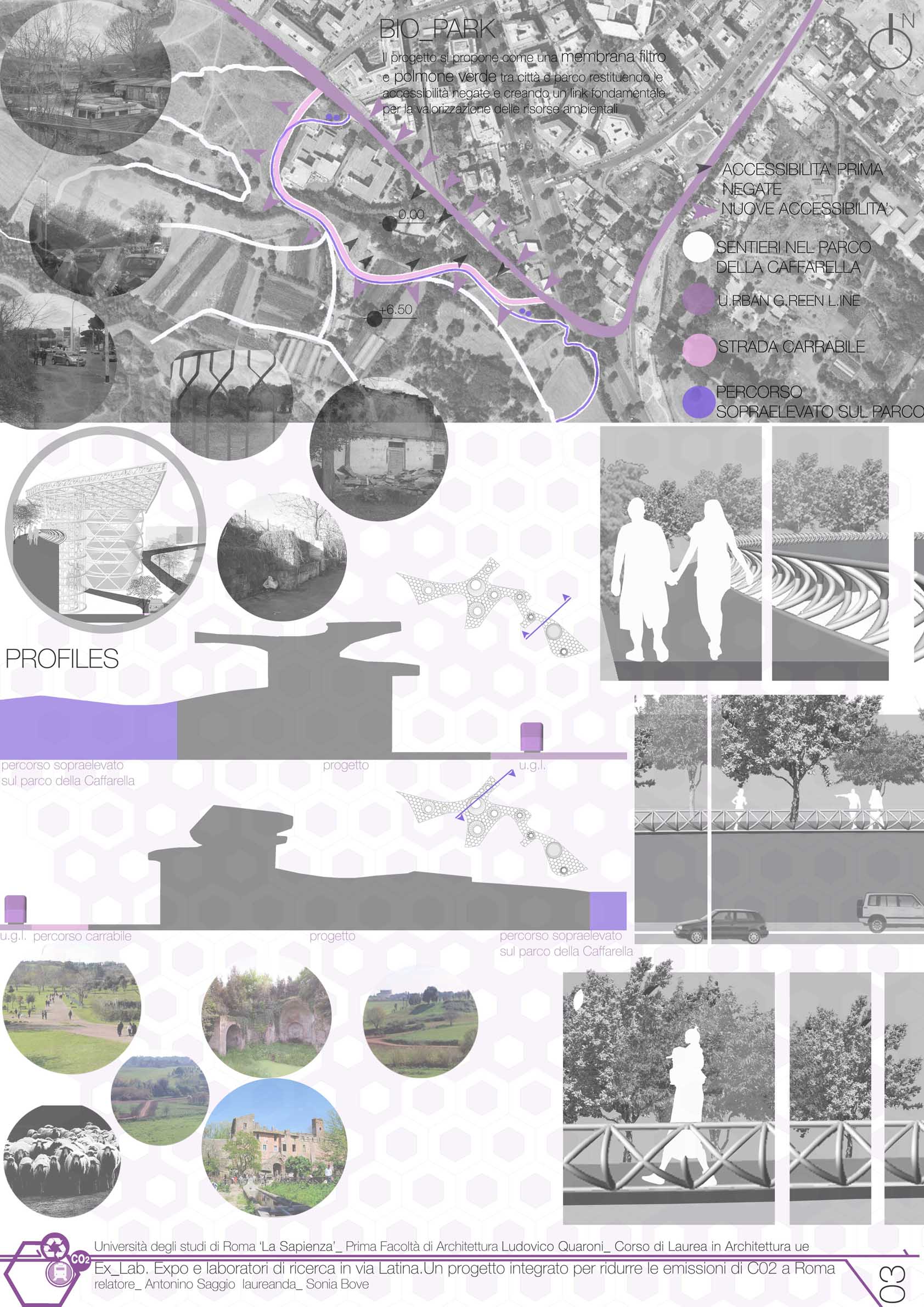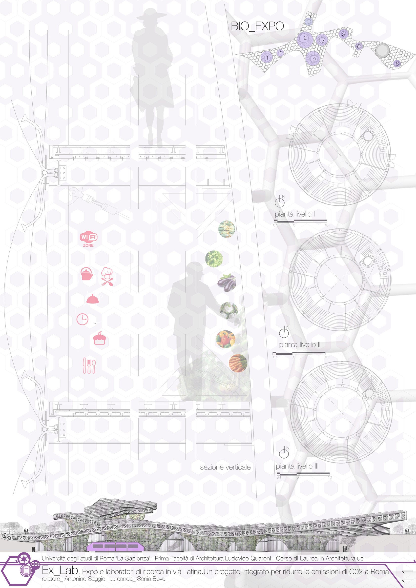 Il progetto si inserisce lungo la Urban green line a ridosso del centro Bio tect contribuendo con esso a fornire un polo per lo sviluppo della cultura sulle energie alternative. Expo e Laboratori di ricerca in via Latina: un progetto per ridurre le emissioni di Co2 a Roma è infatti un complesso di edifici e di spazi che si sviluppano sotto una estesa membrana. La grande membrana, come nel famoso progetto per le Olimpiadi di Monaco, lascia liberamente fluire i visitatori come fossero sotto una tenda sospesa e allo stesso tempo accoglie una serie di edifici propriamente detti. In questo caso i corpi edilizi hanno forma cilindrica e ospitano dei laboratori di ricerca, una serie di attrezzature commerciali e un edificio misto anche con funzioni residenziale. Due altri aspetti costituiscono la chiave del progetto: innanzituttola grande membrana funge anche come sorta di portico di accoglienza e di entrata al parco dell'Appia nel suo lato meridionale. Un'accessibiltà oggi completamente negata. Lo studio progettuale ha individuato in una costruzione completamente abusiva la possibiltà di avere un accesso a cui ppunto Ex Lab si connette . Il secondo elemento chiave del progetto è il materiale scelto per la grande tenda. Si tratta dell'denominato Efte (che già moltie brillanti utilizzi ha avuto negli ultimi anni). Il materiale in questo contesto è decisvo non solo per ottenere la specifica morfologia della tenda, ma anche perchè contiene una serie di componenti importanti dal punto di vista bioclimatico: tra l'altro è depurante e allo stesso tempo contiene al suo interno ricettori per produrre energia fotovoltaica. Ex Lab in definitiva si propone come una membrana filtro e un polmone verde - in alcune parti abitato da edifici - che si pone tra città e parco. Restituisce al Parco della Caffarella una accessibilità oggi negata e crea un legame fondamentale per la valorizzazione delle risorse ambientali nell'anello della Ugl.