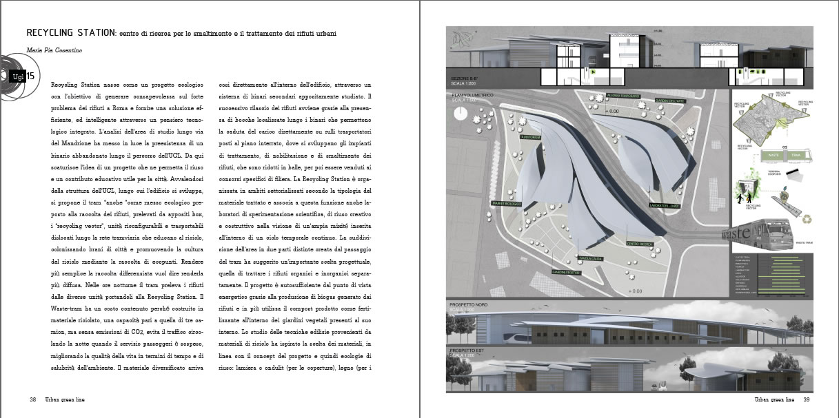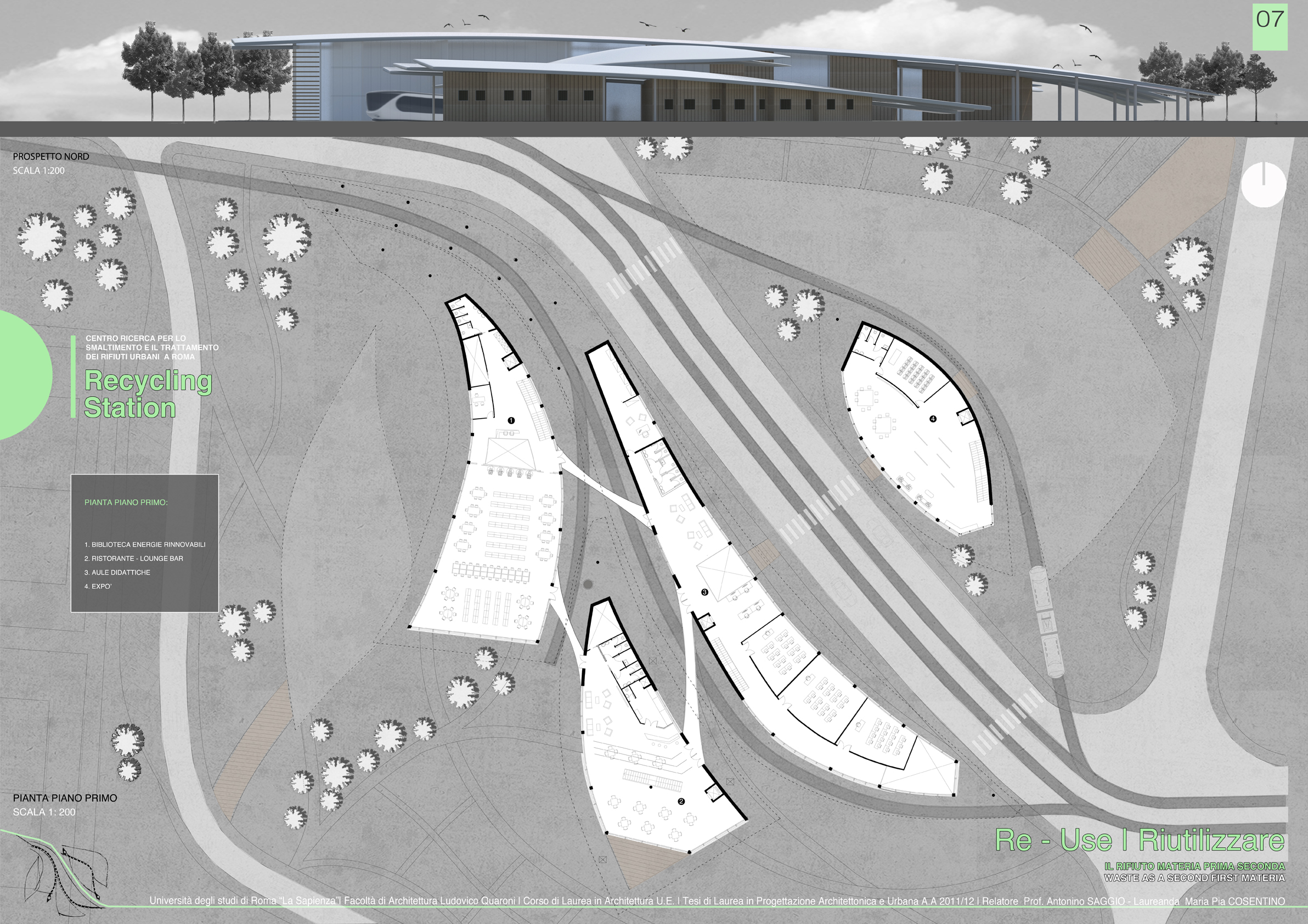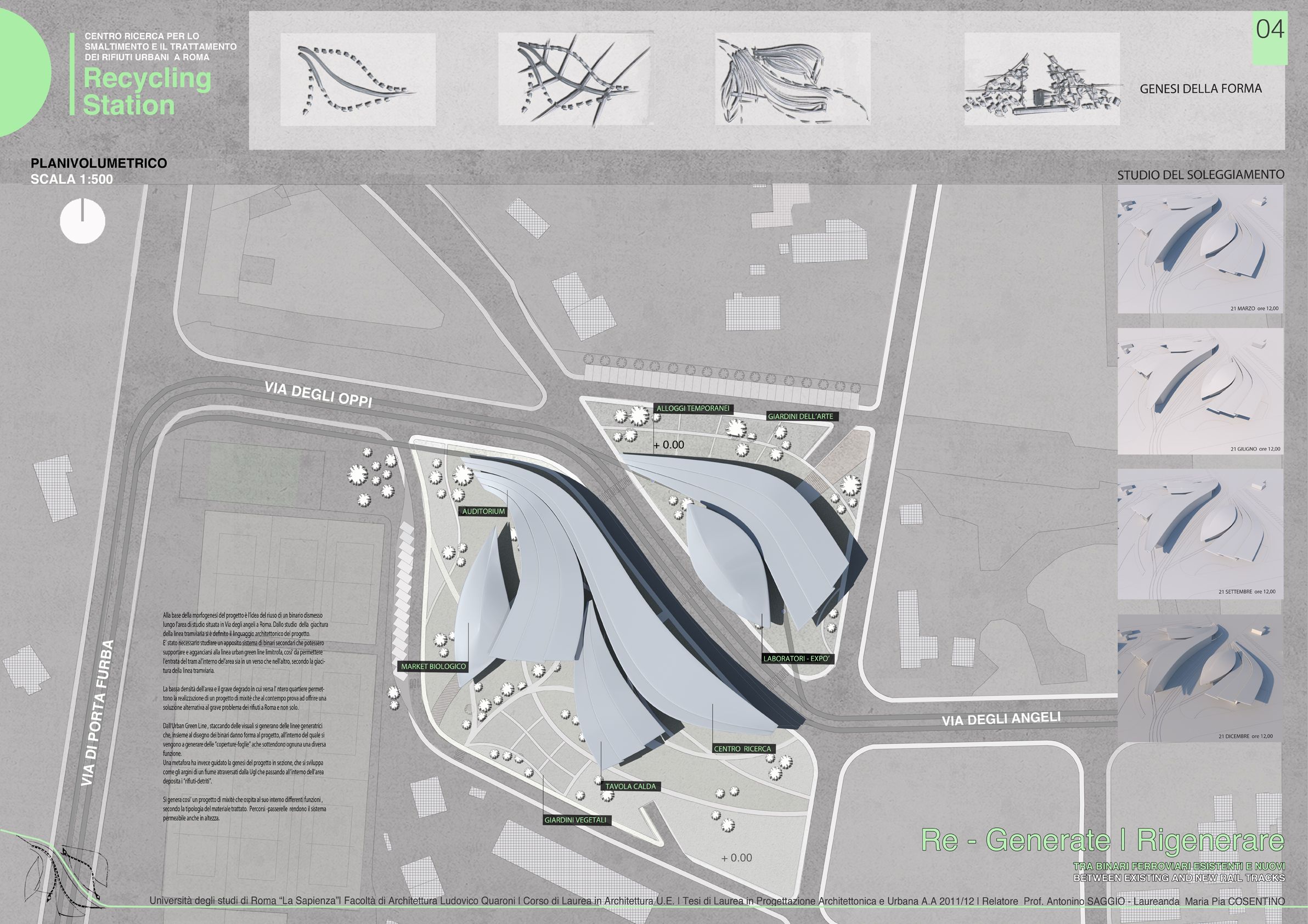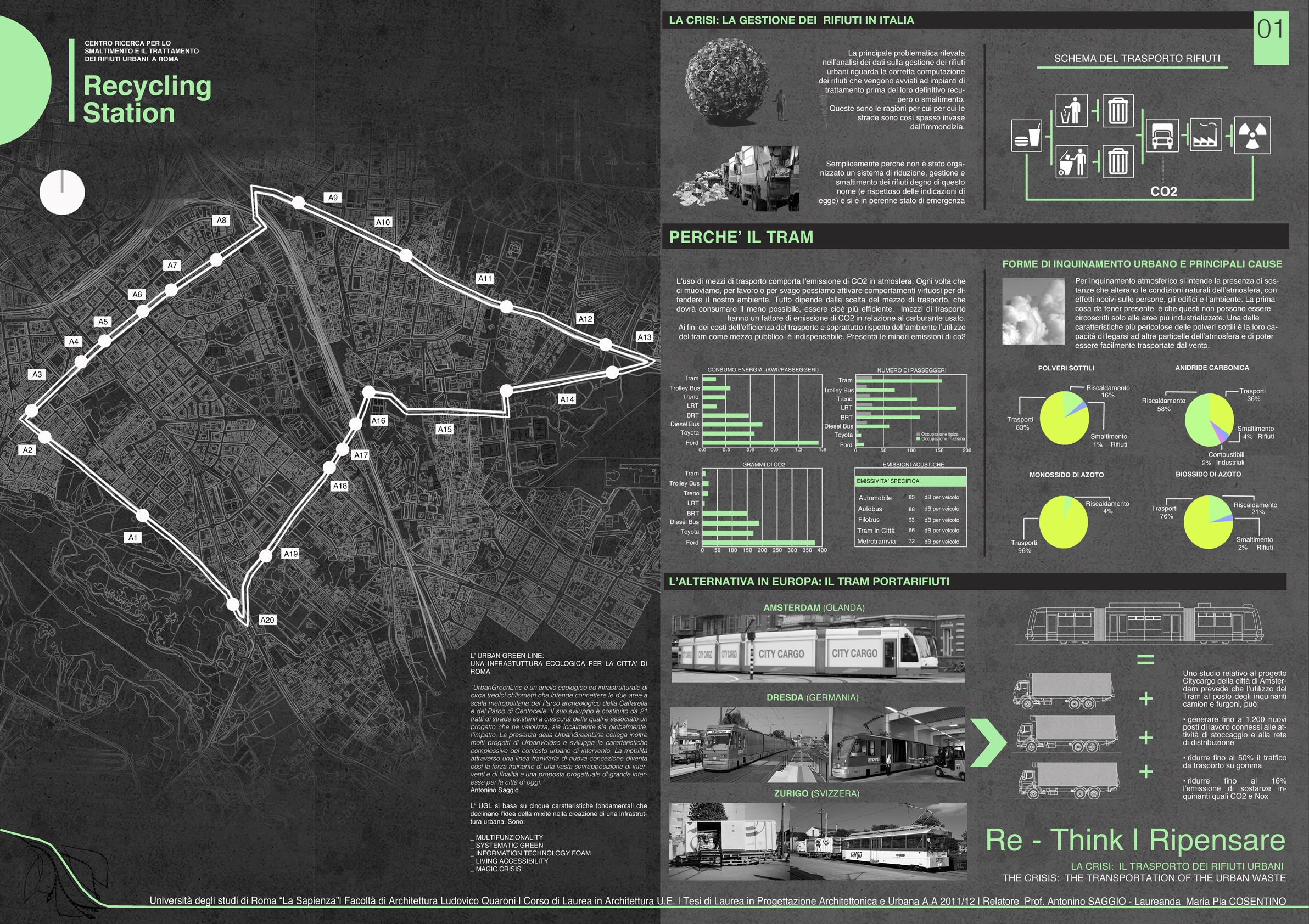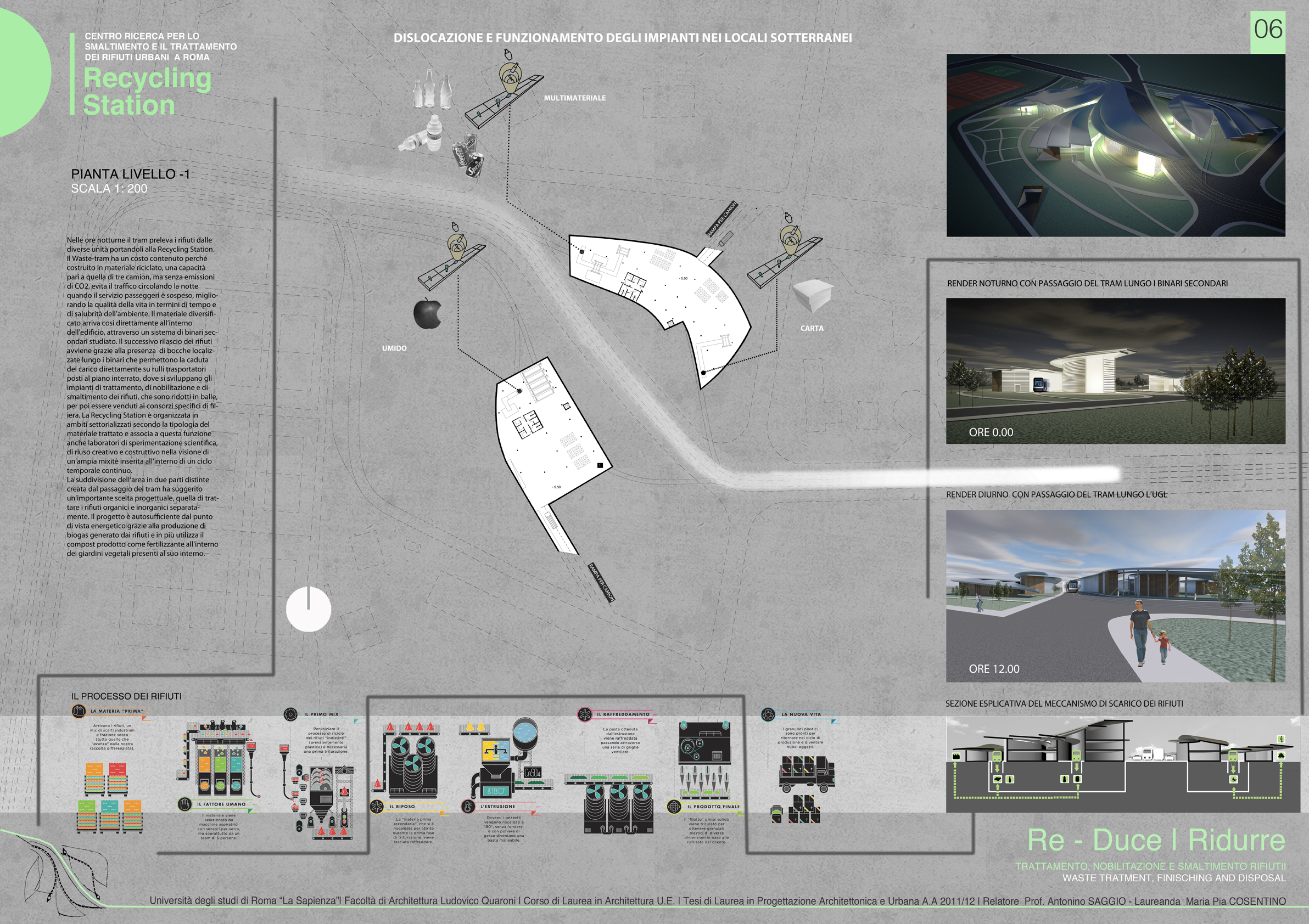 Recycling Station nasce come un progetto ecologico con l’obiettivo di generare consapevolezza sul forte problema dei rifiuti a Roma e di fornire una soluzione efficiente ed intelligente attraverso un pensiero tecnologico integrato. L’analisi dell’area di studio lungo via del Mandrione ha messo in luce la preesistenza di un binario abbandonato lungo il percorso dell’UGL. Da qui scaturisce l’idea di un progetto che ne permetta il riuso e un contributo educativo utile per la città. Avvalendosi della struttura dell’UGL, lungo cui l’edificio si sviluppa, si propone il tram “anche” come mezzo ecologico preposto alla raccolta dei rifiuti, prelevati da appositi box, i “recycling vector”, unità riconfigurabili e trasportabili dislocati lungo la rete tramviaria che educano al riciclo, colonizzando brani di città e promuovendo la cultura del riciclo mediante la raccolta di ecopunti. Rendere più semplice la raccolta differenziata vuol dire renderla più diffusa. Nelle ore notturne il tram preleva i rifiuti dalle diverse unità portandoli alla Recycling Station. Il Waste-tram ha un costo contenuto perché costruito in materiale riciclato, ha una capacità pari a quella di tre camion, ma senza emissioni di CO2. Inoltre evita il traffico circolando la notte quando il servizio passeggeri è sospeso, migliorando la qualità della vita in termini di tempo e di salubrità dell’ambiente. Il materiale diversificato arriva inoltre direttamente all’interno dell’edificio, attraverso un sistema di binari secondari appositamente studiato. Il successivo rilascio dei rifiuti avviene grazie alla presenza di bocche localizzate lungo i binari che permettono la caduta del carico direttamente su rulli trasportatori posti al piano interrato, dove si sviluppano gli impianti di trattamento, di nobilitazione e di smaltimento dei rifiuti, che sono ridotti in balle, per poi essere venduti ai consorzi specifici di filiera. La Recycling Station è organizzata in ambiti settorializzati secondo la tipologia del materiale trattato e associa a questa funzione anche laboratori di sperimentazione scientifica, di riuso creativo e costruttivo nella visione di un’ampia mixité inserita all’interno di un ciclo temporale continuo. La suddivisione dell‘area in due parti distinte creata dal passaggio del tram ha suggerito un’importante scelta progettuale, quella di trattare i rifiuti organici e inorganici separatamente. Il progetto è autosufficiente dal punto di vista energetico grazie alla produzione di biogas generato dai rifiuti e in più utilizza il compost prodotto come fertilizzante all’interno dei giardini vegetali presenti al suo interno. Lo studio delle tecniche edilizie provenienti da materiali di riciclo ha ispirato la scelta dei materiali del progetto che sono tra gli altri: la lamiera o l'ondulit (per le coperture), il legno (per i fronti esterni) e l'acciaio riciclato (per la struttura). Alla base della genesi del progetto è proprio la presenza del tram e il riuso del binario dismesso. È stato studiato un apposito sistema di binari secondari che potessero agganciarsi alla linea urban green line e permettere l’entrata del tram all’interno dell’area sia in un verso sia nell’altro. Dalla giacitura della linea tramviaria si è definito la composizione generale del progetto perchè le linee generatrici che danno forma ai diversi corpi del progetto nascono dal tracciato dei binari. Una metafora ha invece guidato la genesi in sezione, che si sviluppa come gli argini di un fiume attraversati dall’Ugl che, passando all’interno dell’area, deposita i “rifiuti-detriti”. La bassa densità dell’area e il grave degrado in cui versa l’intero quartiere permettono la realizzazione di un progetto di mixité che ospita al suo interno differenti funzioni su più livelli: il piano interrato è destinato allo smaltimento dei rifiuti attraverso i relativi macchinari; al piano terra si trovano i laboratori di ricerca, una sala conferenza, alloggi temporanei, un ristorante e un mercato biologico; al primo livello vi è la parte dedicata alla didattica, con aule studio, una biblioteca e un expò; all’ultimo livello gli uffici. L’architettura stessa evoca la fluidità del movimento del tram e genera uno spazio dinamico, variabile, all’interno del quale delle “coperture-foglie” sottendono ciascuna una diversa funzione sottostante.