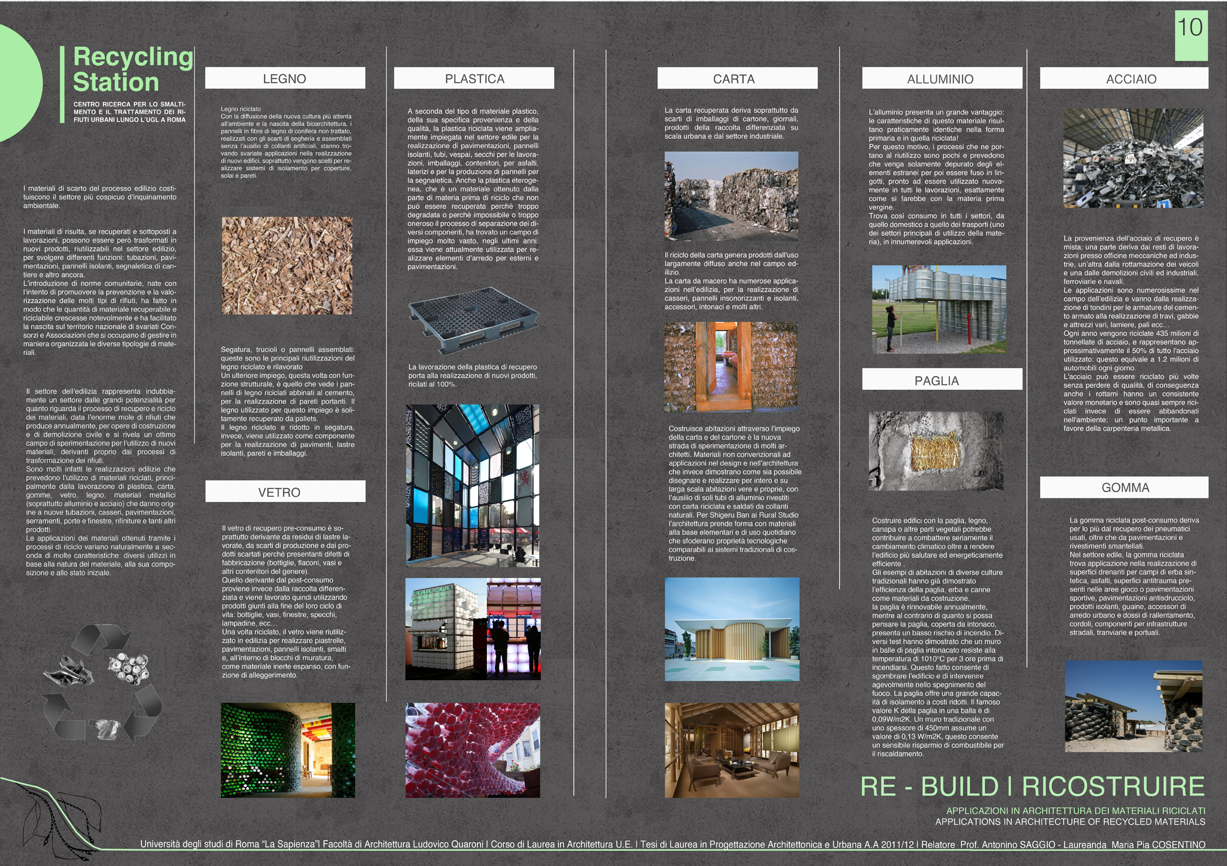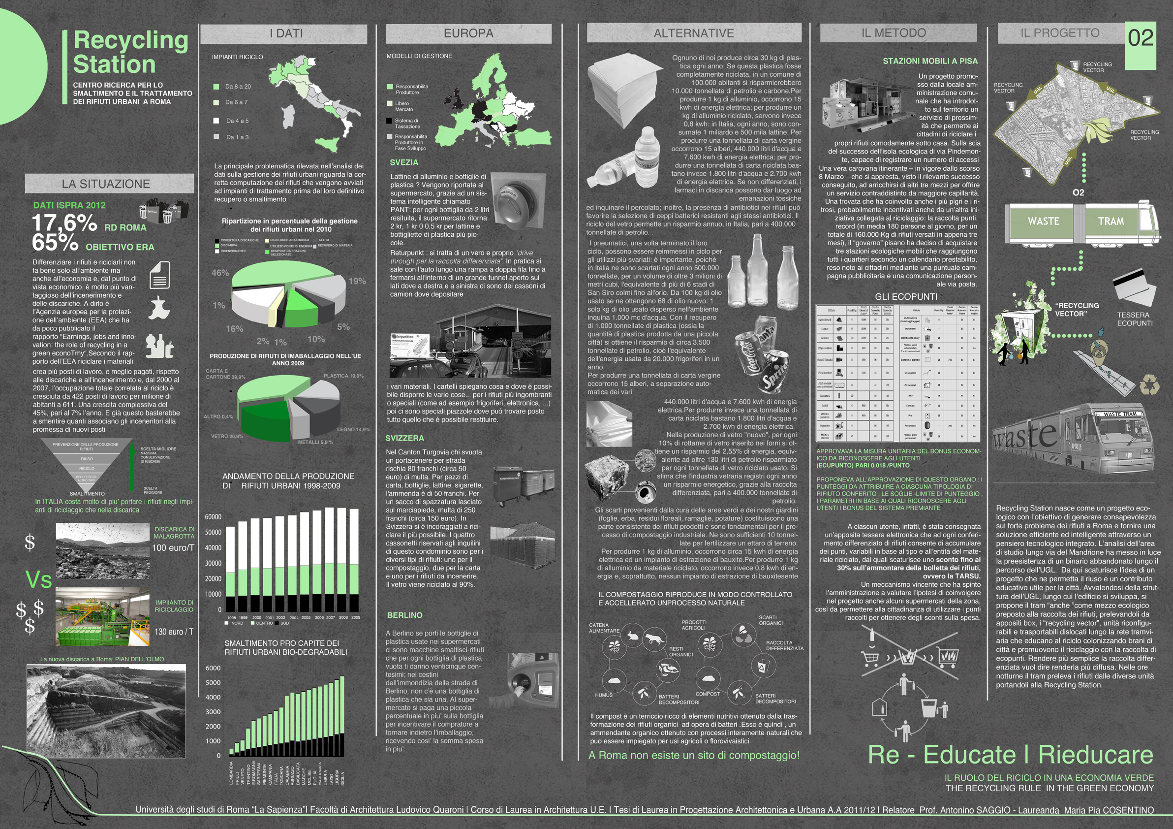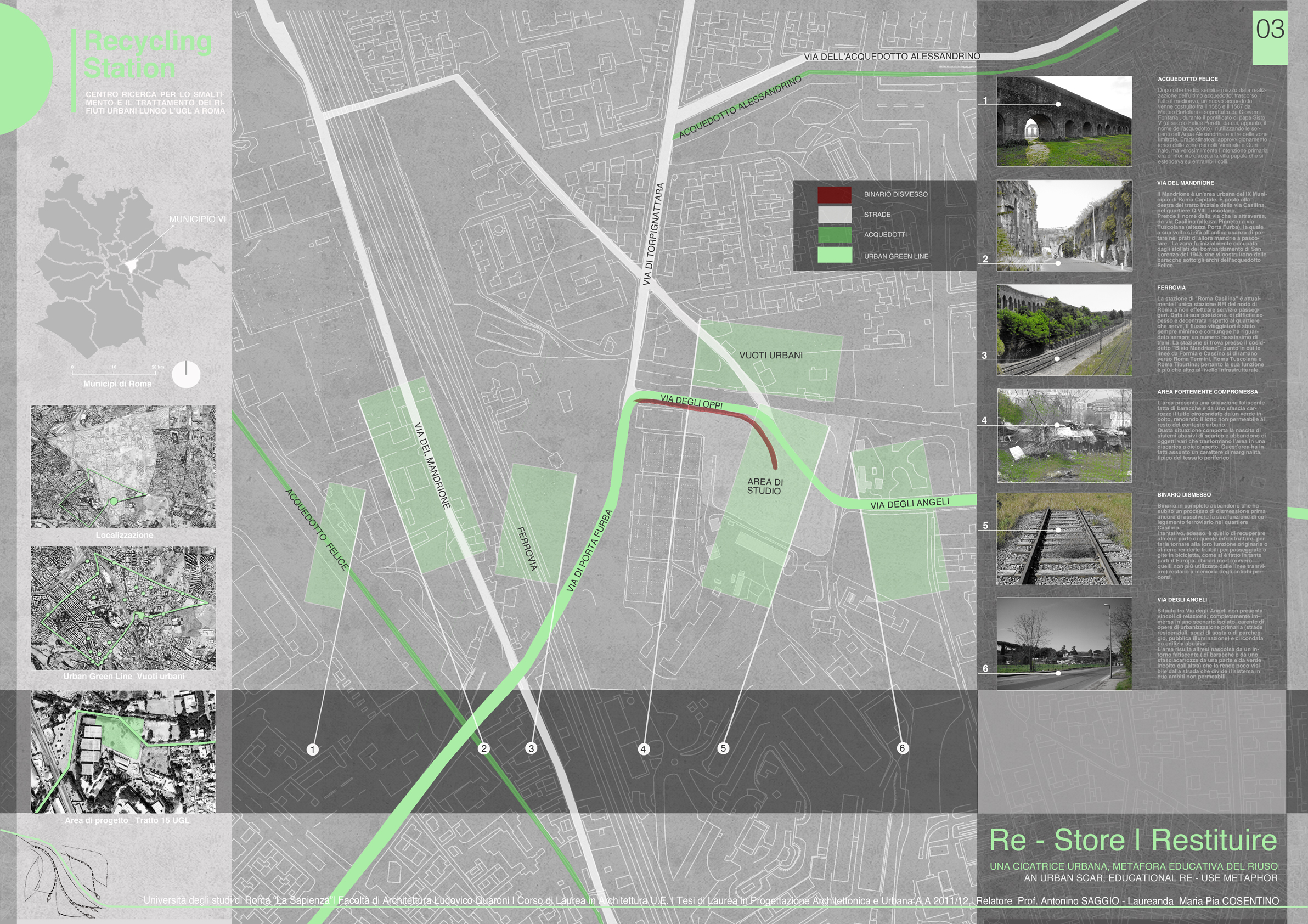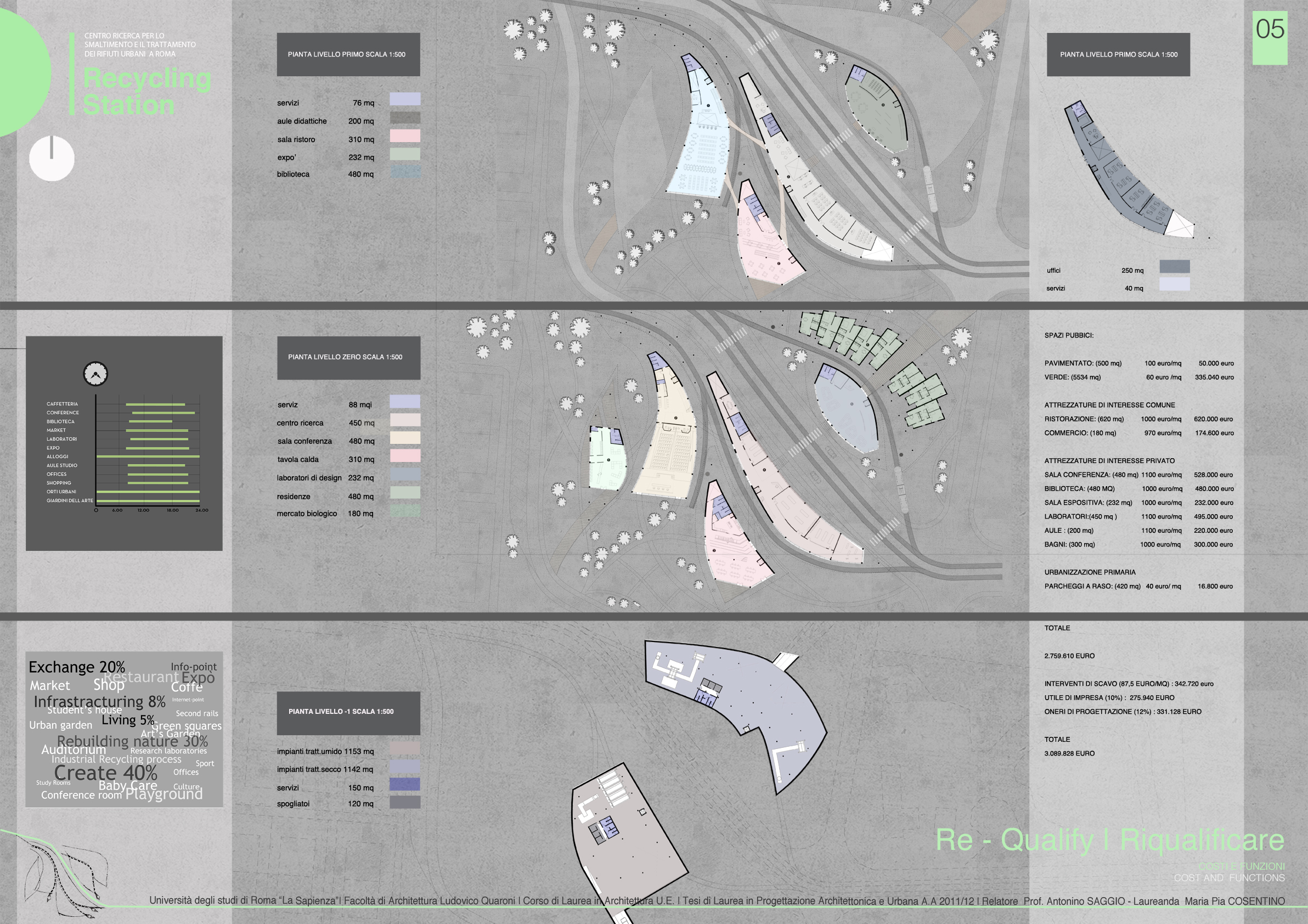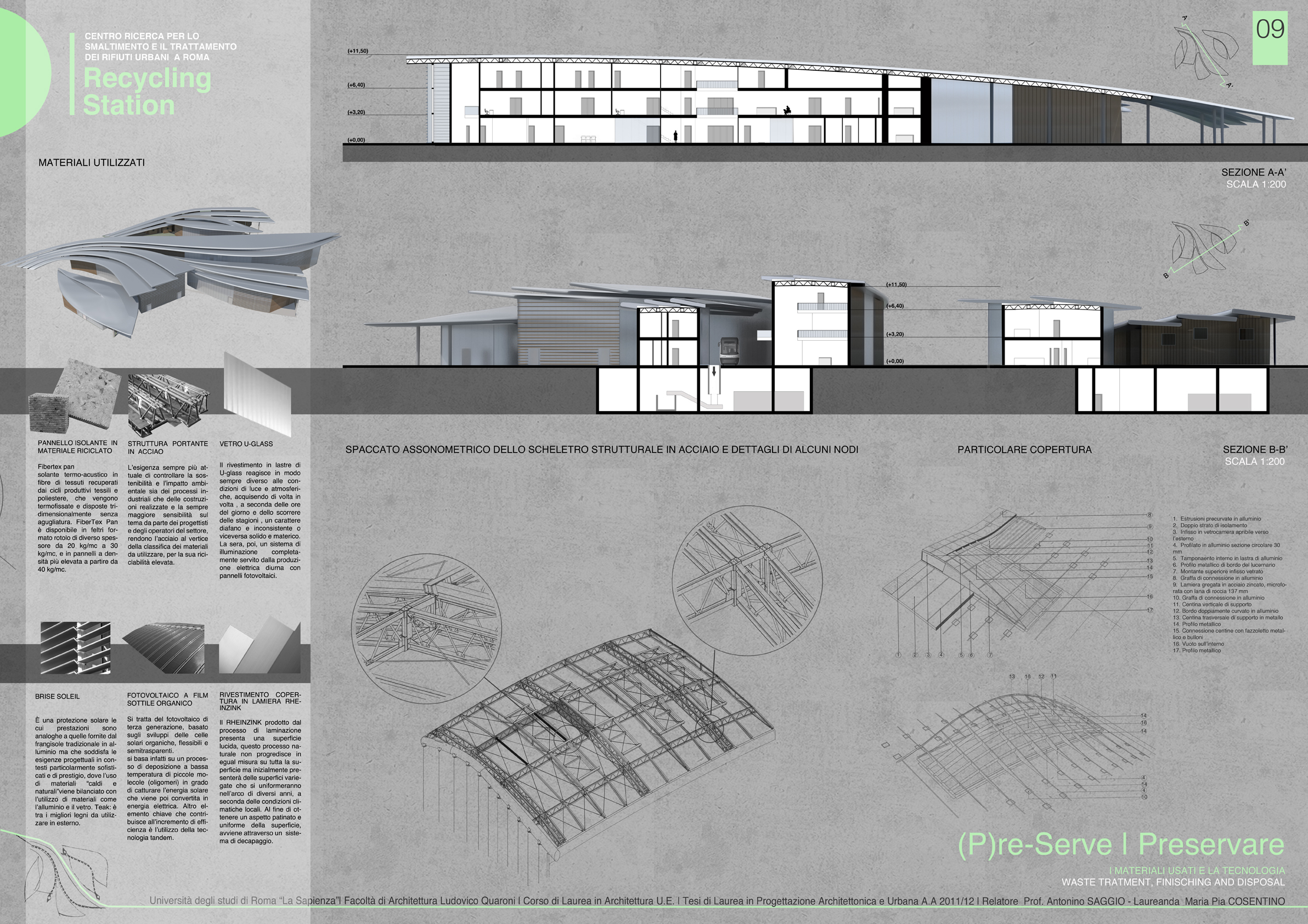 Recycling Station nasce come un progetto ecologico con l’obiettivo di generare consapevolezza sul forte problema dei rifiuti a Roma e di fornire una soluzione efficiente ed intelligente attraverso un pensiero tecnologico integrato. L’analisi dell’area di studio lungo via del Mandrione ha messo in luce la preesistenza di un binario abbandonato lungo il percorso dell’UGL. Da qui scaturisce l’idea di un progetto che ne permetta il riuso e un contributo educativo utile per la città. Avvalendosi della struttura dell’UGL, lungo cui l’edificio si sviluppa, si propone il tram “anche” come mezzo ecologico preposto alla raccolta dei rifiuti, prelevati da appositi box, i “recycling vector”, unità riconfigurabili e trasportabili dislocati lungo la rete tramviaria che educano al riciclo, colonizzando brani di città e promuovendo la cultura del riciclo mediante la raccolta di ecopunti. Rendere più semplice la raccolta differenziata vuol dire renderla più diffusa. Nelle ore notturne il tram preleva i rifiuti dalle diverse unità portandoli alla Recycling Station. Il Waste-tram ha un costo contenuto perché costruito in materiale riciclato, ha una capacità pari a quella di tre camion, ma senza emissioni di CO2. Inoltre evita il traffico circolando la notte quando il servizio passeggeri è sospeso, migliorando la qualità della vita in termini di tempo e di salubrità dell’ambiente. Il materiale diversificato arriva inoltre direttamente all’interno dell’edificio, attraverso un sistema di binari secondari appositamente studiato. Il successivo rilascio dei rifiuti avviene grazie alla presenza di bocche localizzate lungo i binari che permettono la caduta del carico direttamente su rulli trasportatori posti al piano interrato, dove si sviluppano gli impianti di trattamento, di nobilitazione e di smaltimento dei rifiuti, che sono ridotti in balle, per poi essere venduti ai consorzi specifici di filiera. La Recycling Station è organizzata in ambiti settorializzati secondo la tipologia del materiale trattato e associa a questa funzione anche laboratori di sperimentazione scientifica, di riuso creativo e costruttivo nella visione di un’ampia mixité inserita all’interno di un ciclo temporale continuo. La suddivisione dell‘area in due parti distinte creata dal passaggio del tram ha suggerito un’importante scelta progettuale, quella di trattare i rifiuti organici e inorganici separatamente. Il progetto è autosufficiente dal punto di vista energetico grazie alla produzione di biogas generato dai rifiuti e in più utilizza il compost prodotto come fertilizzante all’interno dei giardini vegetali presenti al suo interno. Lo studio delle tecniche edilizie provenienti da materiali di riciclo ha ispirato la scelta dei materiali del progetto che sono tra gli altri: la lamiera o l'ondulit (per le coperture), il legno (per i fronti esterni) e l'acciaio riciclato (per la struttura). Alla base della genesi del progetto è proprio la presenza del tram e il riuso del binario dismesso. È stato studiato un apposito sistema di binari secondari che potessero agganciarsi alla linea urban green line e permettere l’entrata del tram all’interno dell’area sia in un verso sia nell’altro. Dalla giacitura della linea tramviaria si è definito la composizione generale del progetto perchè le linee generatrici che danno forma ai diversi corpi del progetto nascono dal tracciato dei binari. Una metafora ha invece guidato la genesi in sezione, che si sviluppa come gli argini di un fiume attraversati dall’Ugl che, passando all’interno dell’area, deposita i “rifiuti-detriti”. La bassa densità dell’area e il grave degrado in cui versa l’intero quartiere permettono la realizzazione di un progetto di mixité che ospita al suo interno differenti funzioni su più livelli: il piano interrato è destinato allo smaltimento dei rifiuti attraverso i relativi macchinari; al piano terra si trovano i laboratori di ricerca, una sala conferenza, alloggi temporanei, un ristorante e un mercato biologico; al primo livello vi è la parte dedicata alla didattica, con aule studio, una biblioteca e un expò; all’ultimo livello gli uffici. L’architettura stessa evoca la fluidità del movimento del tram e genera uno spazio dinamico, variabile, all’interno del quale delle “coperture-foglie” sottendono ciascuna una diversa funzione sottostante.