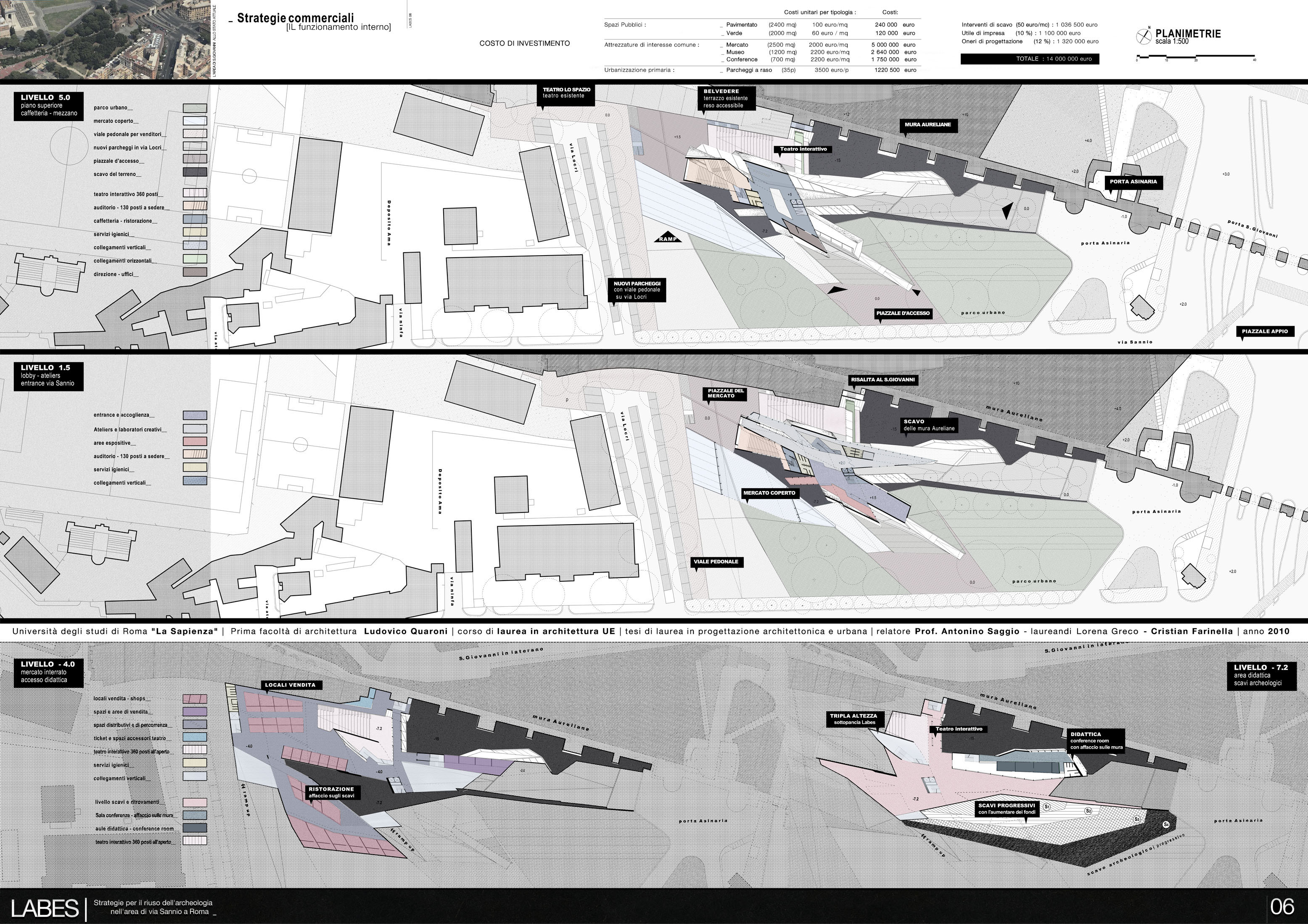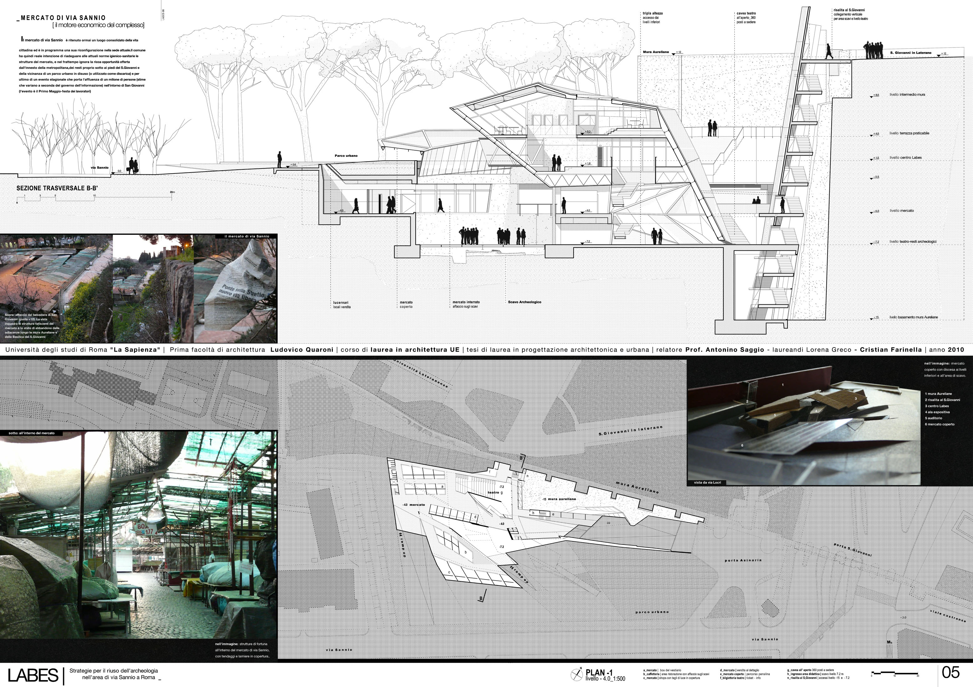 Dal punto di vista del programma d'uso, il progetto propone un misto di attività che prevedono sia la riorganizzazione del mercato di via Sannio, di cui da molti anni si chiede una messa a norma anche dal punto di vidta degli impianti e della sicurezza, una serie articolata di ambienti commerciali, una zona culturale ed educativa ed una per lo sviluppo attivo dell'archeolgogia sia con ambienti per laboratori e conferenze sia attraverso percorsi che permettano di vedere oltre agli scavi ultimati anche quelli in progress che continueranno a svolgersi negli anni. Inoltre la presenza nell'area di via Sannio di un teatro sperimentale, dà l'occasione concreta di sviluppare anche una zona del progetto a questo scopo. Alla via “dell’oblio archeologico”, a cui tante e tante parti della nostra città i resti archeologici sono confinati, si preferisce duque quello della “memoria viva”. Memoria che qui è anche finanziata dal motore economico che questo progetto potrà innestare. Ai mega centri commericiali che erodono territorio e propongono modelli tra l'altro superati anche commercialmente, Labes sostituisce il valore della complessità funzionale, della mixitè, dell'intelligenza e della stessa specificità archeologica del progetto come forza trainante di una riorganizzazione complessiva. Dal punto di vista spaziale il progetto si articola sviluppando il tema stesso del dislivello, della sezione, dello scavo, del Labes appunto. Una serie di incisioni “chirurgiche” lungo via Sannio rivelano la presenza di resti del passato, danno accesso al nuovo progetto, scavano ancora di più lungo le Mura aurealiane ritrovando il livello archeologico e da questo ricollegano la parte bassa della via con la parte alta di piazza San Giovanni. E' una ricerca che a partire da Lucio Fontana e più di recente da Doris Salcedo mostra che attraverso l'atto della incisione si rivelano mondi e dimensioni inaspettate. Questo tema che è architettonico e funzionale ad un tempo, si sviluppa con un linguaggio dinamico e un sistema costruttivo a grandi travature metalliche che formano pareti e solai e permettono di risolvere con sicurezza le grandi complessità plastiche del progetto. |