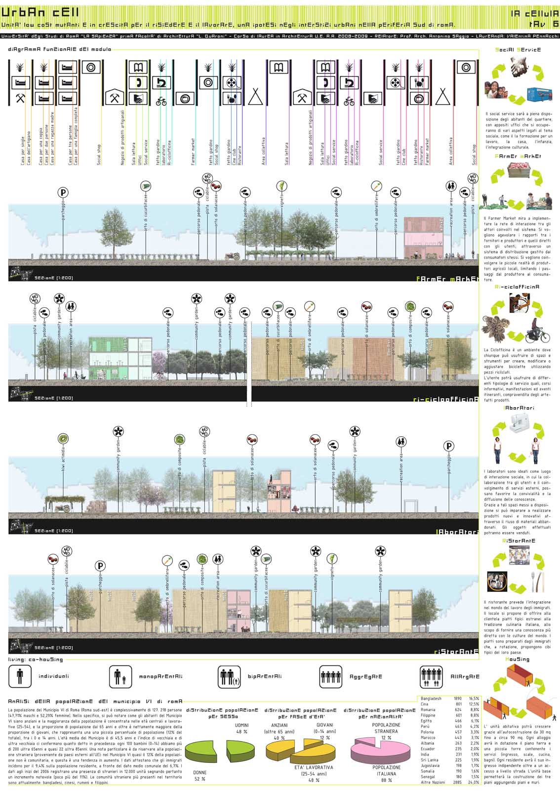 Come operare con progetti a bassa densità in aree urbane marginali ma sottoposte a spinte edificatorie e speculative? La strategia proposta in questo caso propone un insediamento di caratteristica semirurale con abitazioni parizalmente autocostruite e con crescita programmata nel tempo. Si tratta di una strategia che permette di creare insediamenti a basso costo per giovani o nuovi immigrati che conservano e anzi valorizzano il verde interstiziale: un bene prezioso e da difendere della città di Roma.