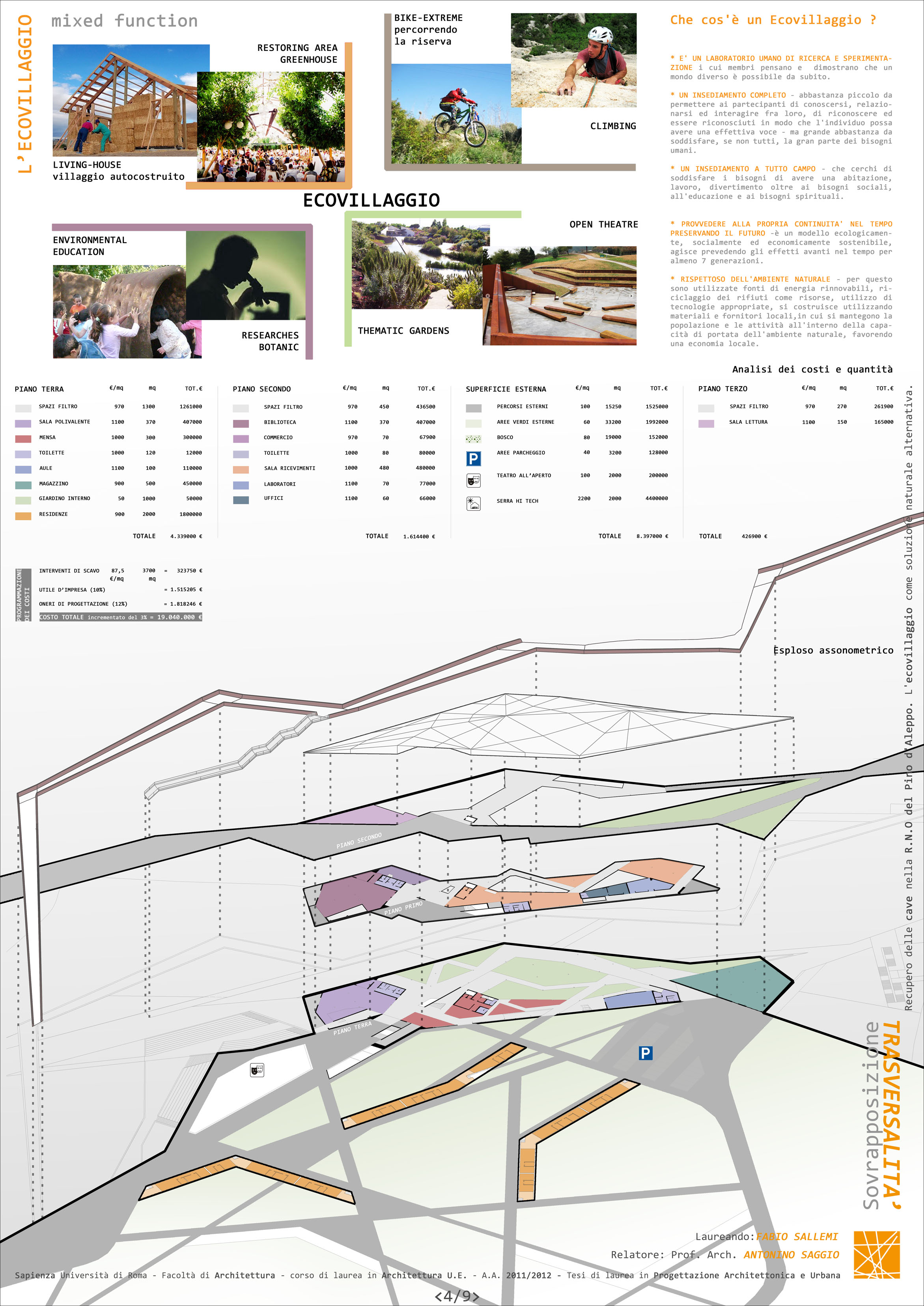 "Lavorare sulla ferita”, ossia utilizzare la morfologia del territorio alterata dalla escavazione per creare inediti paesaggi architettonici, arricchiti di nuovi segni e significati è l’ispirazione del progetto mentre la sua destinazione d’uso è orientato alla creazione di uno spazio particolarmente significativo sotto il profilo della fruizione pubblica. Si proppone la creazione di un “eco-villaggio”, basato sull’educazione e sul rispetto ambientale. Al suo interno si inseriscono percorsi turistico-didattici e attività ludico-sportive. Questo spazio naturale e ricreativo non trascura la promozione della ricerca scientifica e la conoscenza dei beni naturali presenti nel territorio della riserva, ai fini di una maggiore e più sensibile comprensione dell'importanza cruciale delle piante per la vita della biodiversità. Queste attività saranno localizzate in luoghi di studio e di formazione scientifica, di sperimentazione e di didattica (giardini botanici, serre bioclimatiche, laboratori scientifici, aule per la didattica), ma anche in luoghi di ricerca e di diffusione delle informazioni (biblioteca specializzata, sala conferenza) e anche aree di ristoro dove poter assaporare i prodotti locali.