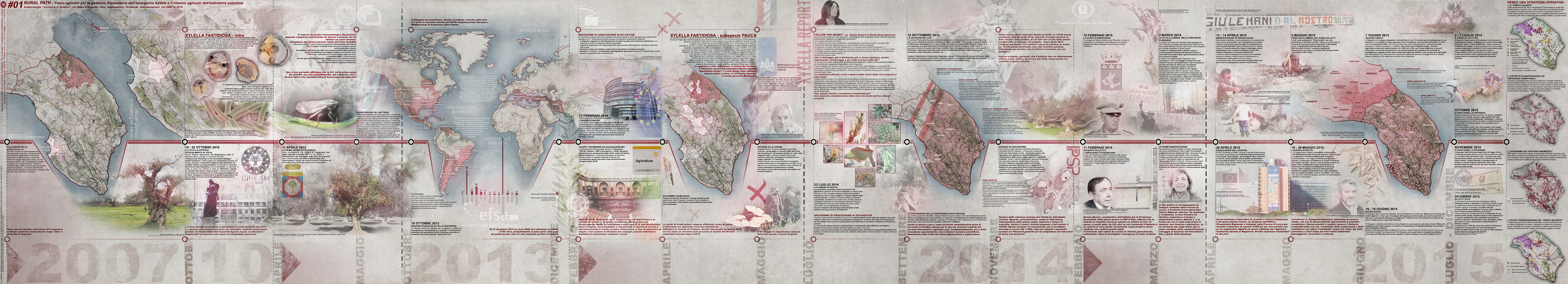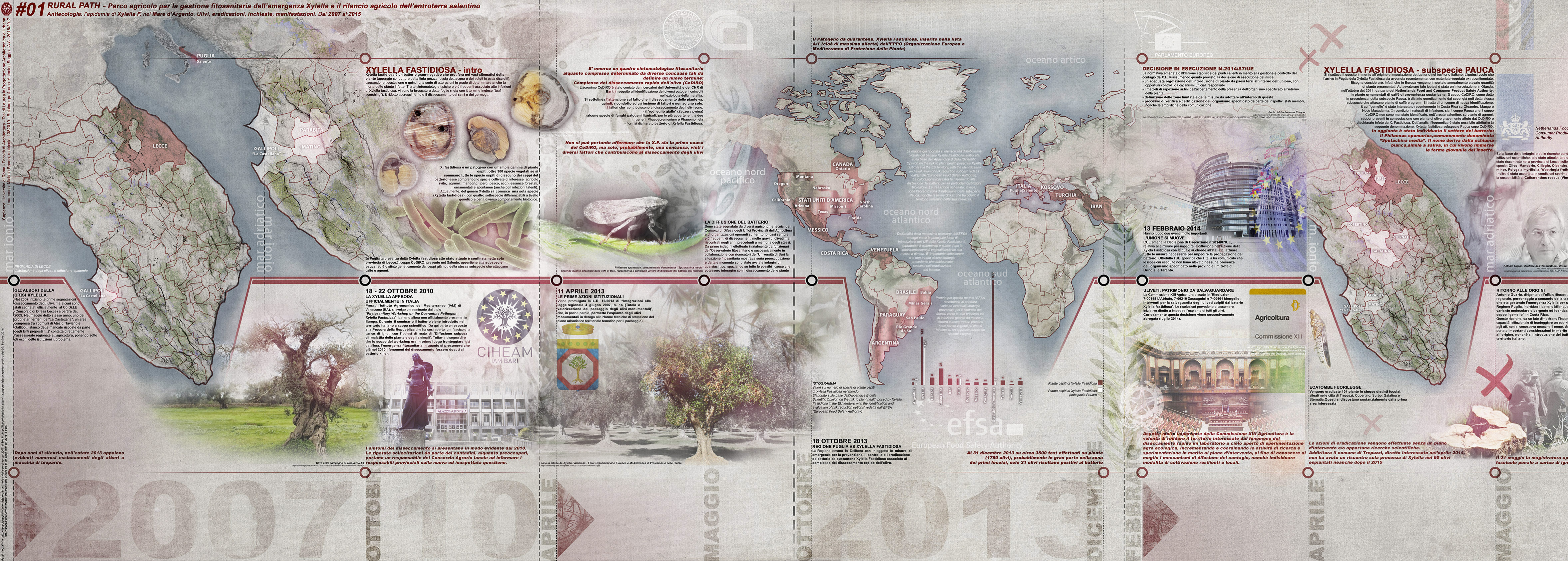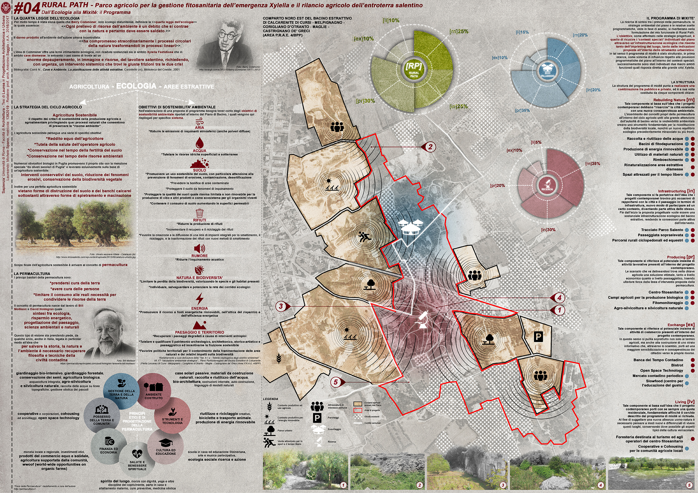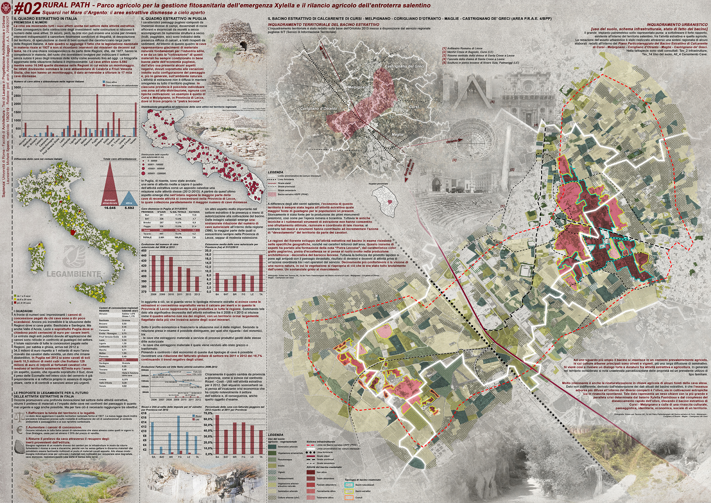 Il territorio del Salento si ritrova così al centro di un'incessante guerra fra deturpazioni agricole da una parte e azione estrattiva incontrollata dall'altra. Porre un freno al quadro negativo che ha caratterizzato l'intera provincia di Lecce, dal 2010 a oggi, vuol dire riflettere anche agli equilibri che per secoli hanno tenuto assieme cave e agricoltura. Ed è proprio in questa direzione che si muove Rural Path, che tenta di proporre innanzitutto un programma adatto ad invertire questa tendenza: il progetto punta in primo luogo a costruire una filiera in situ, chiara e trasparente nella gestione del fenomeno epidemico, soprattutto nel pieno rispetto degli operatori del settore; successivamente intende valorizzare l'agricoltura locale, attività cardine del paesaggio e dell'economia salentina, già vittima delle agromafie; in stretto rapporto a quest'ultimo punto, l'interesse di Rural Path deriva anche dall'attento programma di tutela e valorizzazione del luogo, programma che si confronta con le principali direzioni urbanistiche, dal recupero dei contesti di cava sino al disegno provinciale di promozione del territorio. Tuttavia il cuore dell'intero lavoro è operare una sostanziale ricucitura fra i tratti principali dell'ecosistema locale. Tale ricucitura, fisica oltre che metaforica, viene attuata tramite un network di tracciati che nel rammagliare il Comparto Nord Est del bacino estrattivo, riattivano l'innesto territoriale descritto dal sistema di cave su cui insistono anche spazi periurbani e campi agricoli.