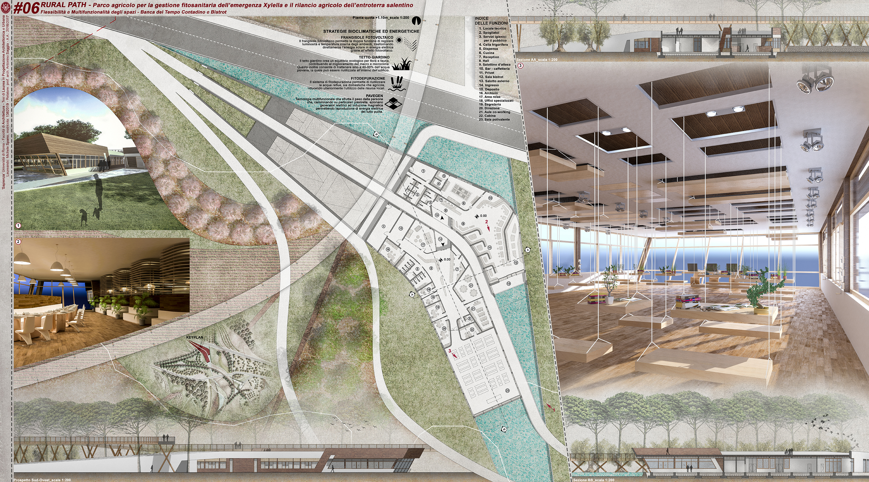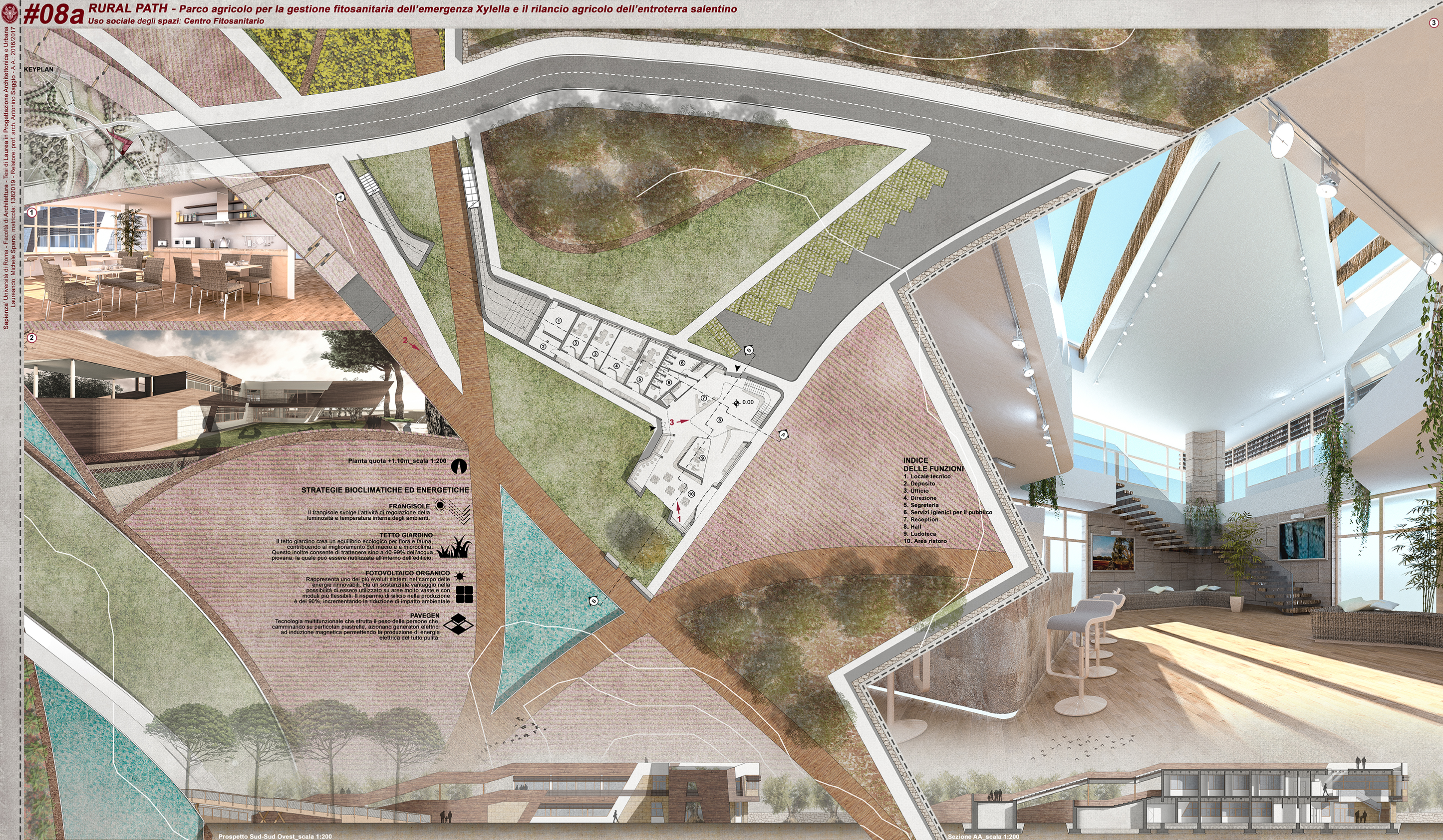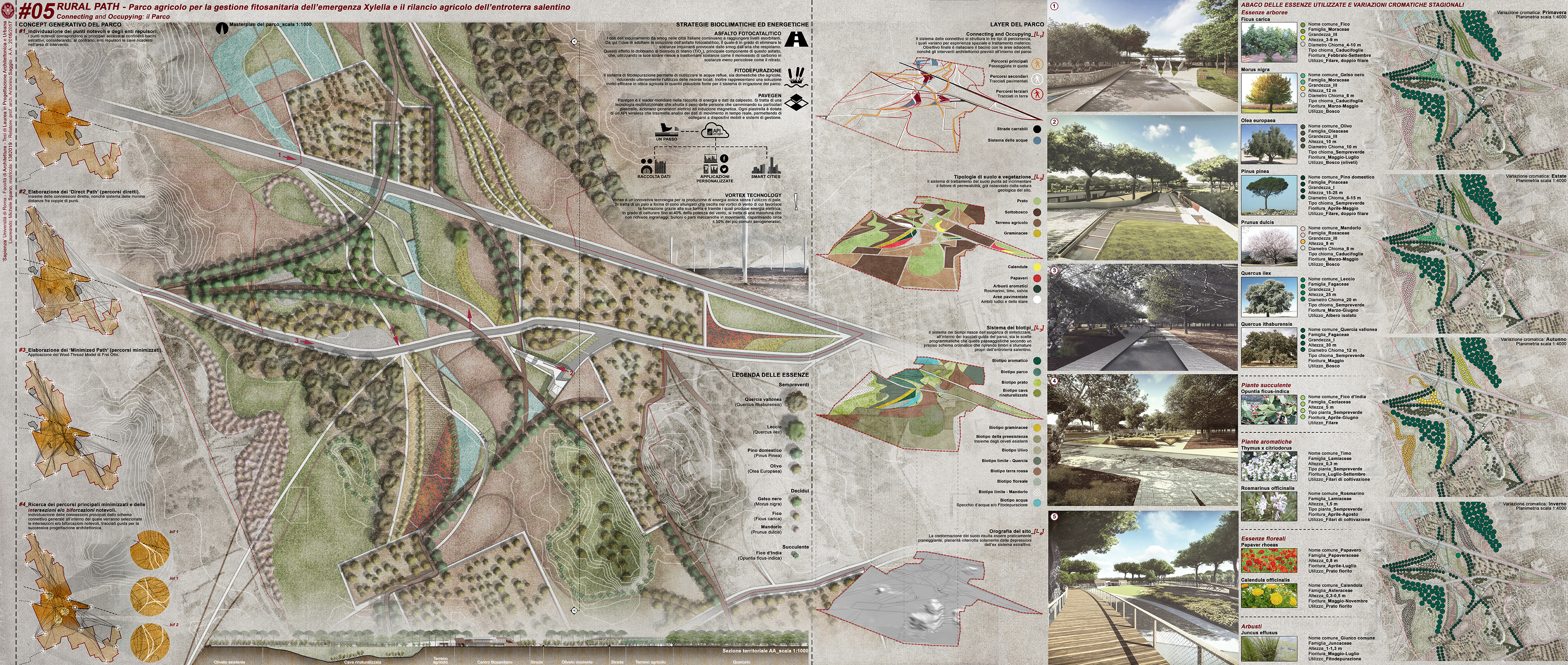 L'insieme dei percorsi rappresentano un vero e proprio diagramma, grazie al quale Rural Path si inserisce in ruoli diversi e interconnessi fra loro: Rural Path infatti è parco agricolo, dimensione tramite cui si valorizza il paesaggio locale a partire dalla natura rurale del sito; è infrastruttura sostenibile, dimensione possibile grazie ad un'attenta gerarchia dei flussi la quale, nel cercare di sostituirsi ai più convenzionali sistemi di collegamento, propone livelli di percorrenza sempre diversi, in grado di raccontare il luogo da molteplici punti di vista; è luogo della ricerca, laboratorio a cielo aperto finalizzato alla gestione dell'emergenza Xylella, all'interno del quale i percorsi costituiscono un sistema di lunghezze ottimizzato al fine di garantire una rapida ricognizione della salute ambientale del territorio. Il network di tracciati rappresenta, in ultima istanza, l'ossatura della struttura programmatica della proposta progettuale, in particolare nel suo relazionarsi con il territorio. Due parole chiave caratterizzano l'operazione: "Eco villaggio", ambito della sperimentazione del nuovo vivere rurale, e "Ricerca", appunto, ambito della sperimentazione agro ecologica e fitosanitaria, votato alla costruzione di un nuovo e condiviso know-how agricolo. I due aspetti rappresentano lo strato superficiale di una strategia ancora più complessa, che punta a combinare pubblico e privato all'interno di un sistema che si muove dal paesaggio all'architettura. Ecco allora che si vedono grandi campi agricoli alternarsi a distese boschive per l'agro - silvicoltura, estensioni floreali a specchi d'acqua per la fitodepurazione, oliveti ad aree ludico - sportive, ambiti fra i quali si muovono piste ciclopedonali, percorsi a cavallo e passeggiate in quota, forme di spostamento sostenibili capaci di regalare esperienze edonistiche del paesaggio salentino, qui riproposto in forme e linguaggio contemporanei.