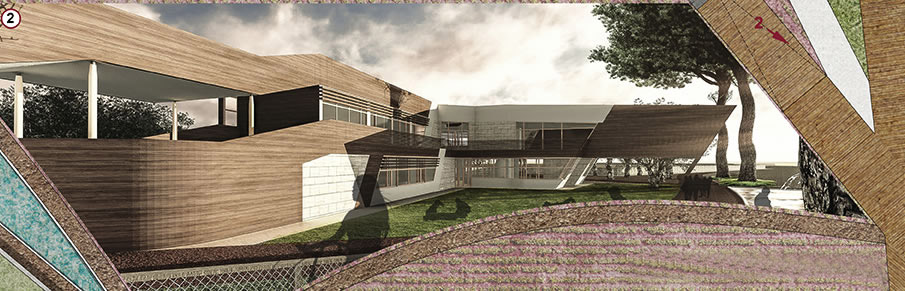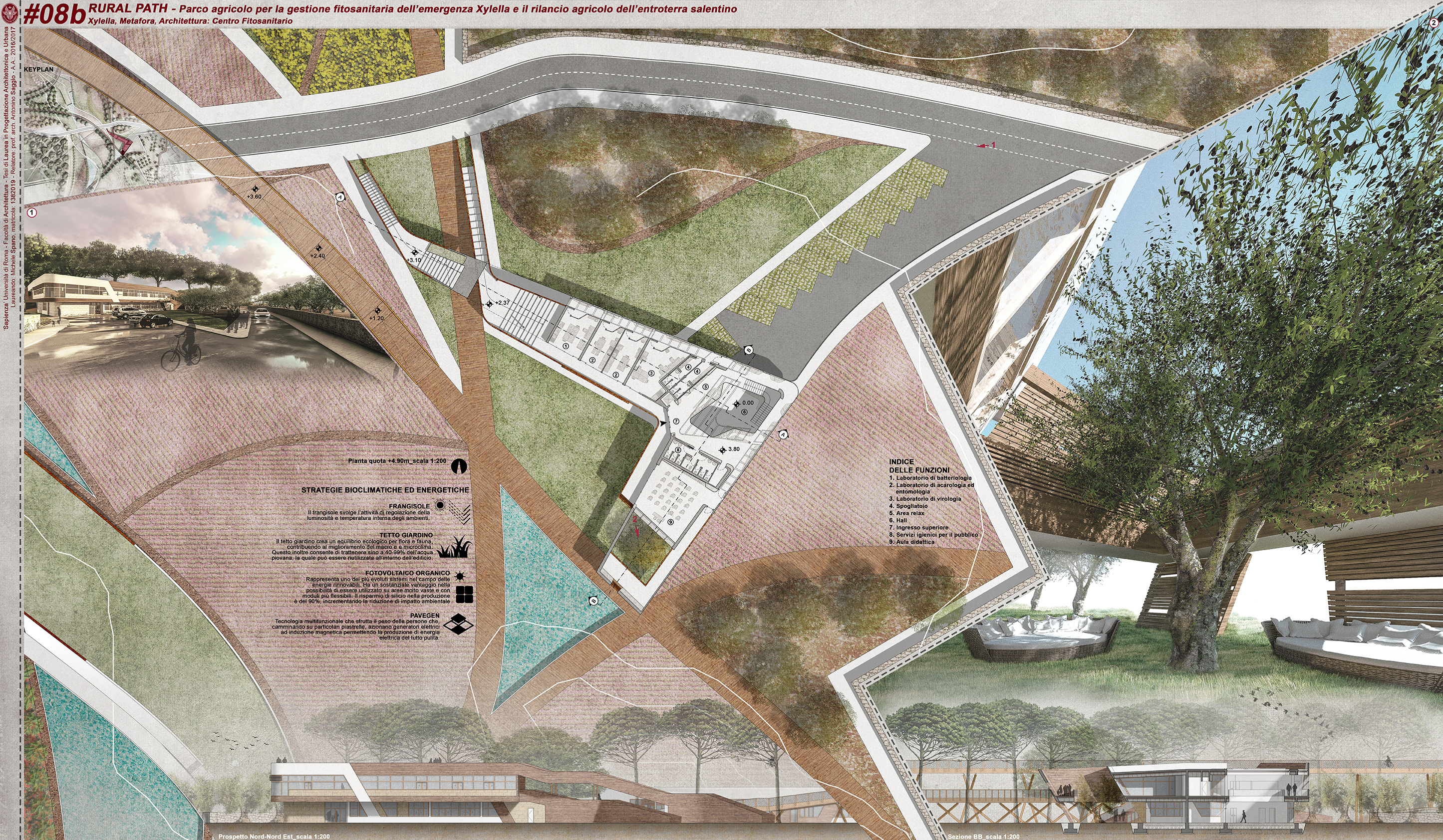Fulcro dell'intero programma proposto è il Centro Fitosanitario che raccoglie l'insieme delle attività destinate alla ricerca e alla sperimentazione nel settore agricolo, vivaistico e floreale. Il corpo, nato da un sostanziale sfioccamento dei tracciati del parco, si sviluppa su due livelli, articolati da una grande hall angolare, luogo della socialità, teatro di frizioni geometriche e distributive, sistema di orientamento grazie alla presenza di grandi lucernari che fluidificano lo spazio in soluzioni di continuità visiva e spaziale. Sulla testata dell'edificio insiste un luogo simbolico per l'intero intervento: un giardino segreto che accoglie e nasconde la chioma di un ulivo, messaggio politico oltre che metaforico, luogo di speranza e di monito allo stesso tempo per la fragilità di questo territorio.