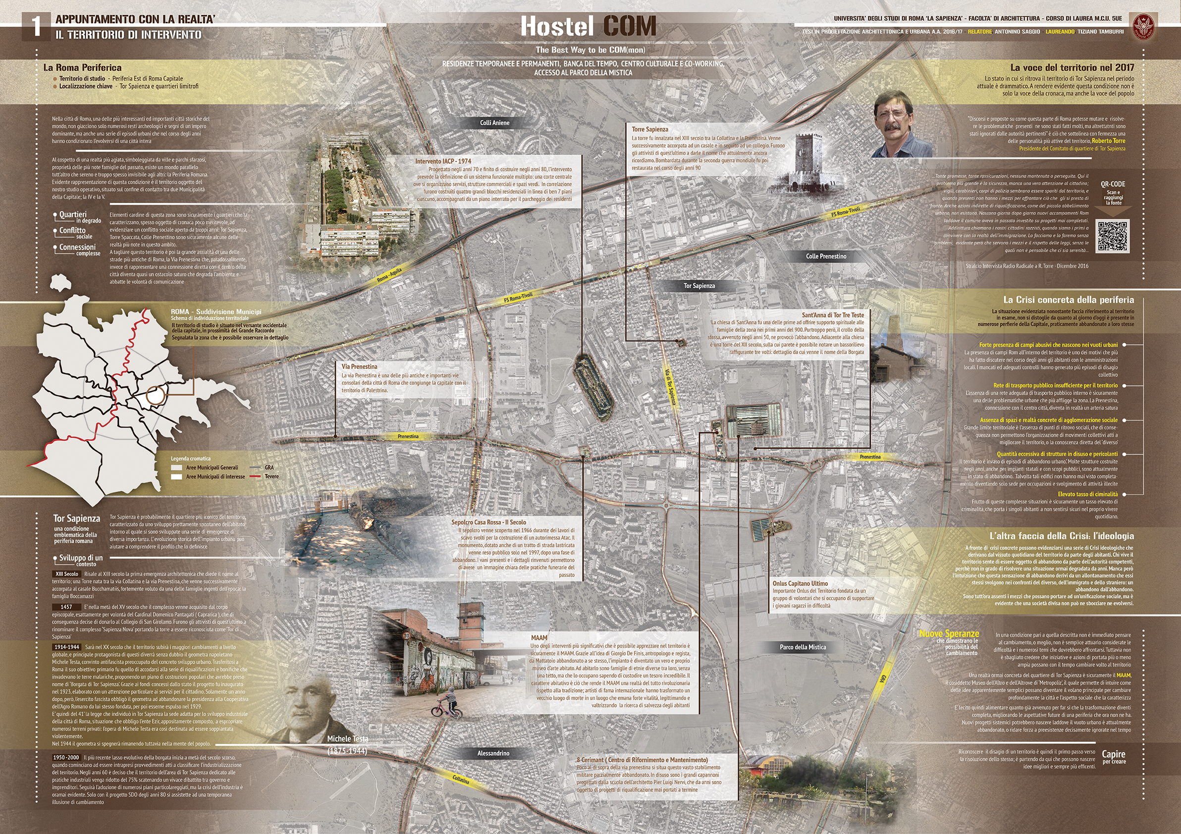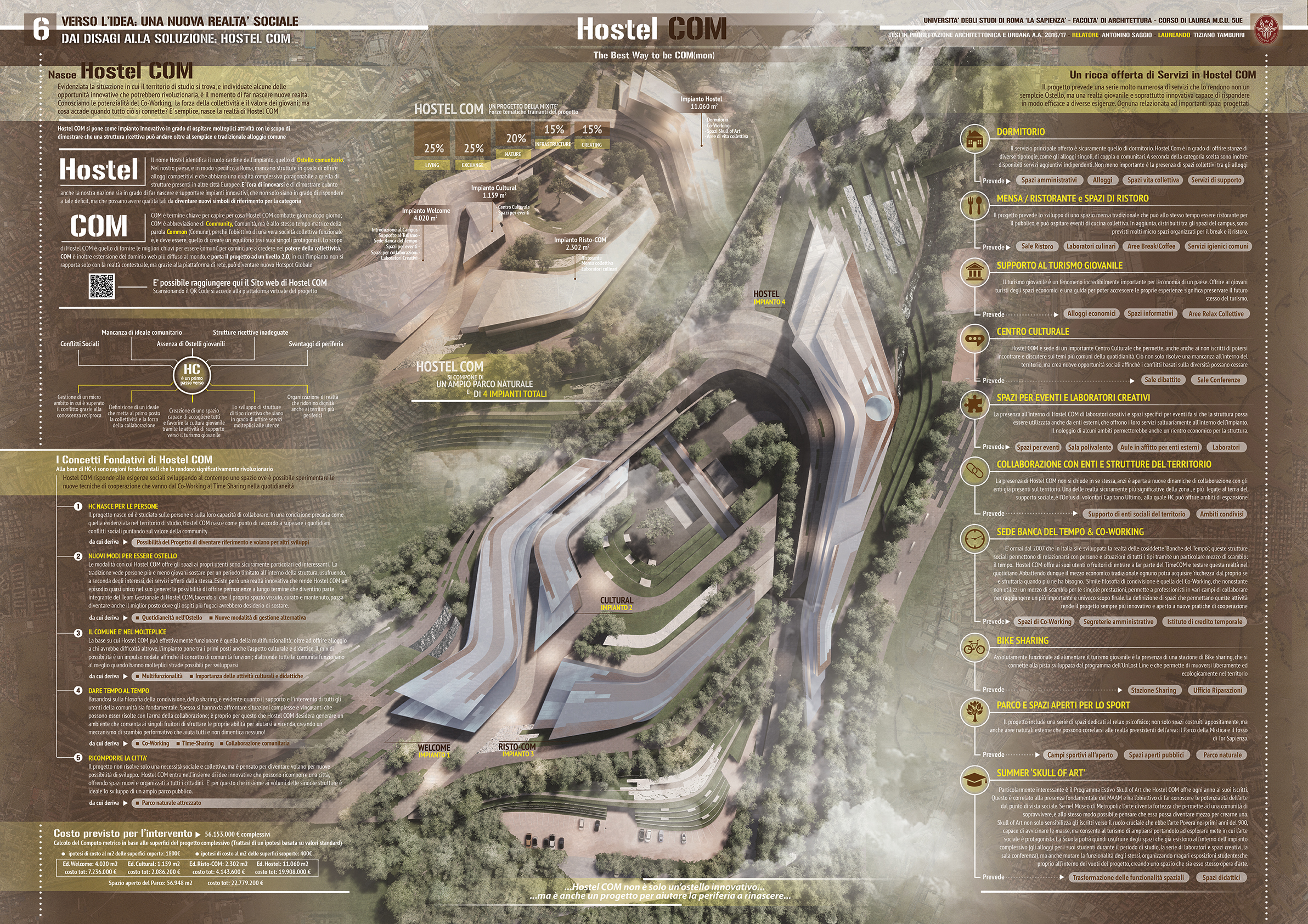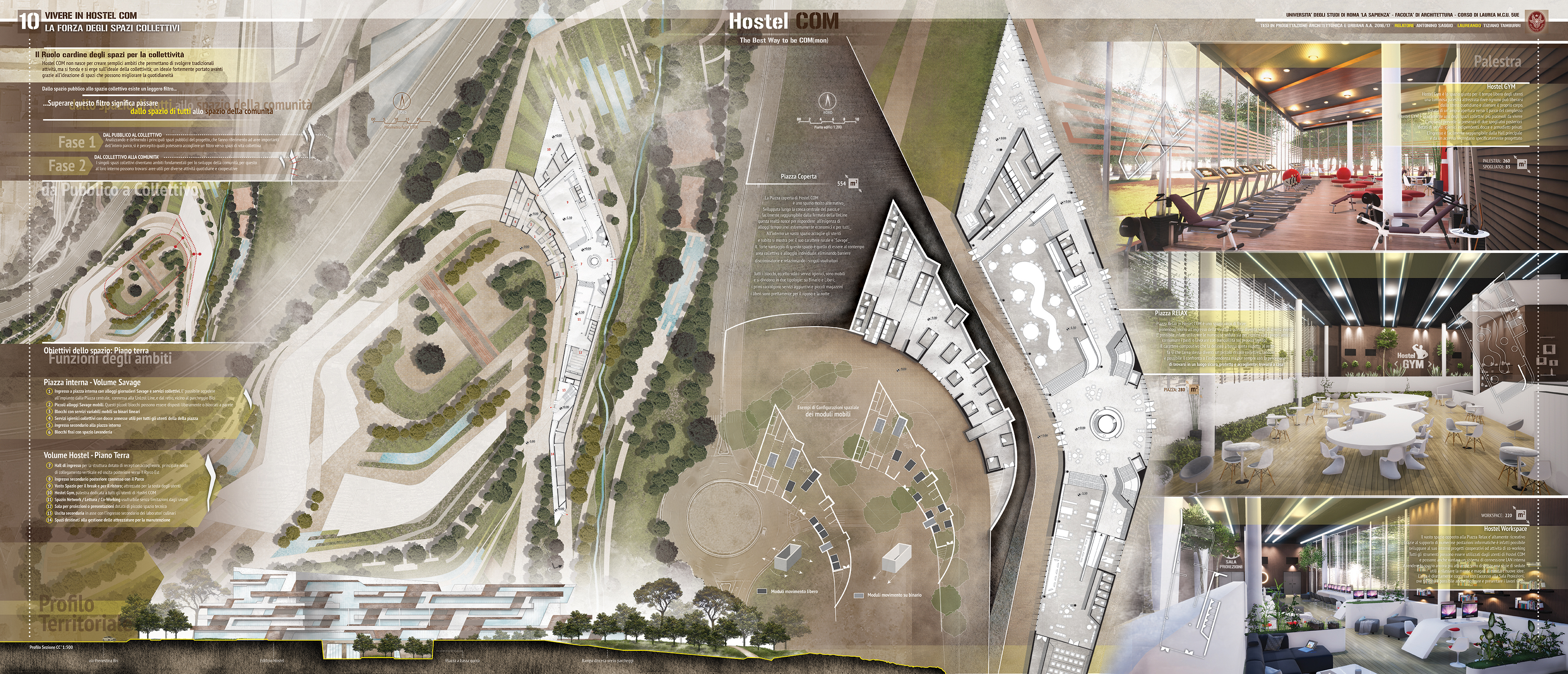 In un territorio complesso come quello della periferia romana in particolare nella zona lungo la via Prenestina Bis all’altezza del parco della Mistica nasce il progetto Hostel COM, Residenze temporanee e permanenti, Banca del tempo, Centro culturale e Co-Working, Accesso al Parco. Si tratta di una realtà innovativa che si pone l’obiettivo di creare valori di socialità troppo spesso perduti nelle nostre città e allo stesso tempo fornire una significativa attrezzatura nella città di Roma. Se analizzino il contesto urbano del Municipio V di Roma emerge la presenza di grandi arterie viarie come la Prenestina, la Tiburtina, via Palmiro Togliatti che si estendono sino al GRA che determinano un tessuto fortemente disconnesso morfologicamente. In particolare il quartiere di Tor Sapienza è legato a eventi socialmente molto gravi. Tra le criticità ben note vi è l’inefficienza dei collegamenti con i mezzi pubblici, la forte presenza di campi abusivi, la diffusa esistenza di edifici abbandonati e pericolanti, l’elevato tasso di criminalità. Tra questi assume primaria rilevanza quella che spesso viene ignorata: una crisi che nasce a partire dalla mancanza di luoghi aggregativi, di aree urbane ad uso collettive e di strutture a servizio dei giovani. A seguito di crisi così evidenti, intensificate dal continuo conflitto tra popolazione locale e comunità immigrate, si afferma uno stato di malessere sociale diffuso che privilegia un agire individualistico, che dimentica il grande valore che hanno invece la collettività e la cooperazione all’interno della città. E’ proprio a partire da tale considerazione che nasce la proposta del progetto Hostel COM che innanzitutto intende innescare enzimi in controtendenza per iniziare a far rinascere meccanismi di condivisione.