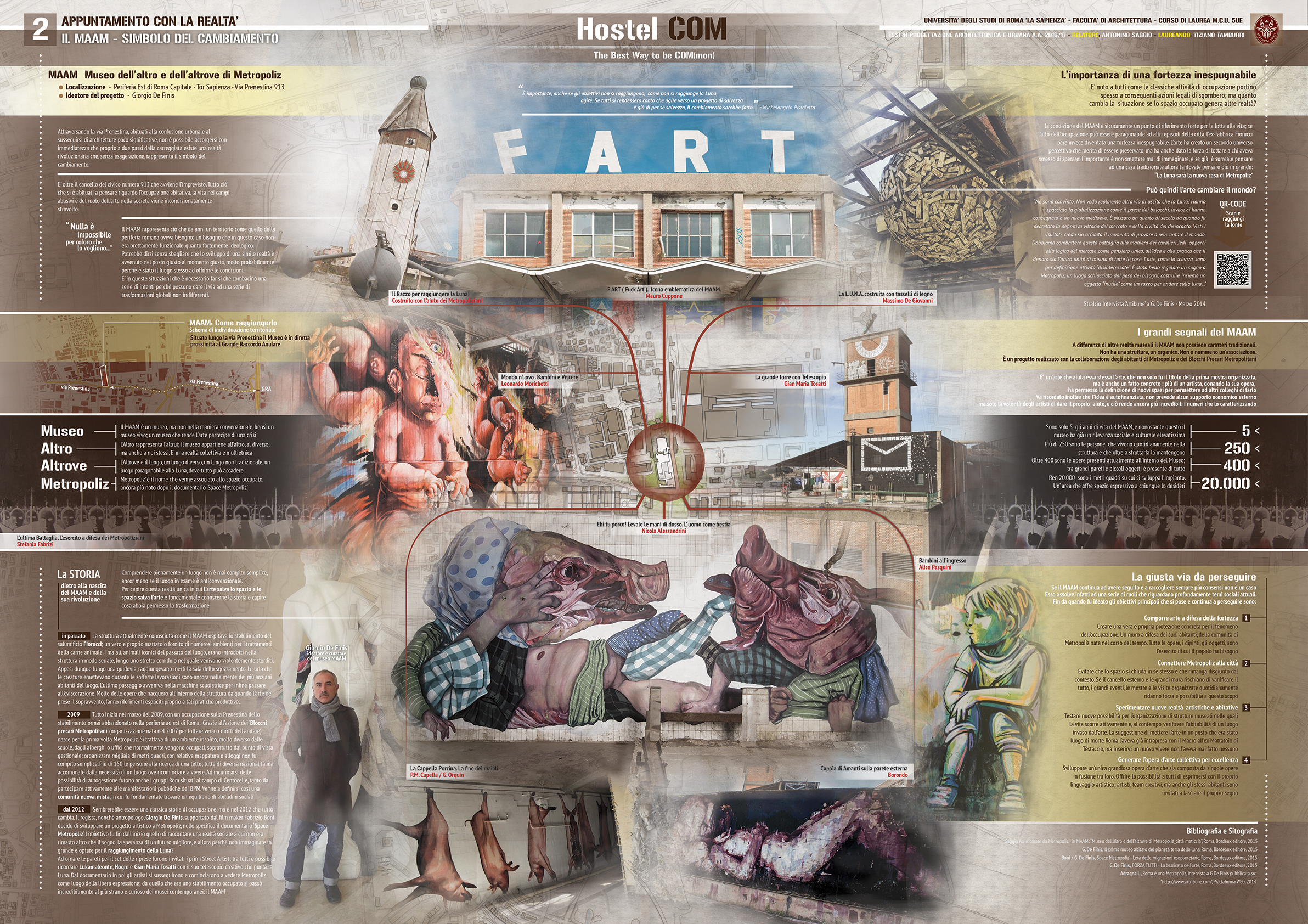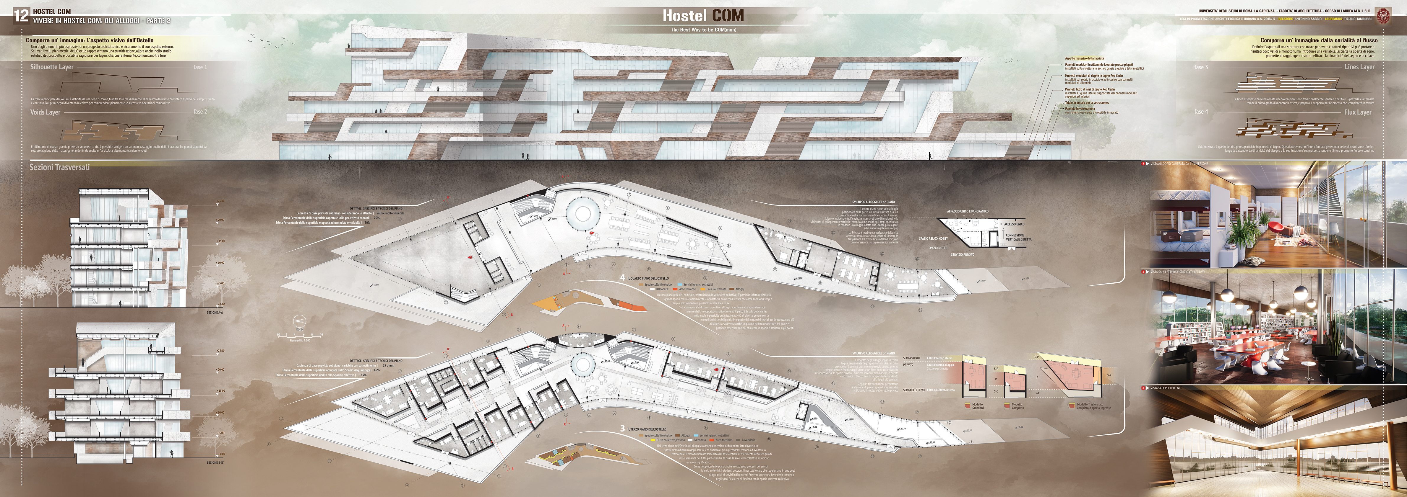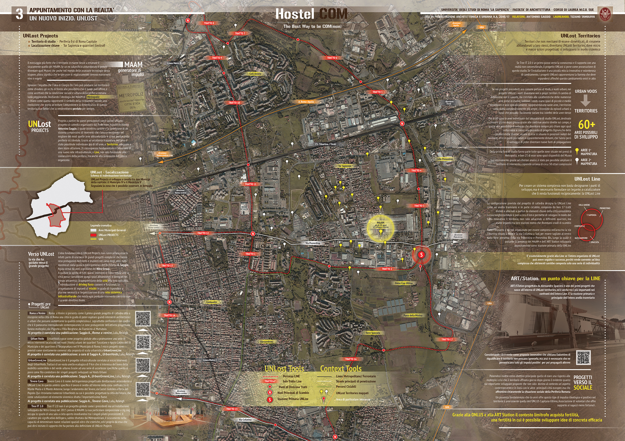 In un territorio complesso come quello della periferia romana in particolare nella zona lungo la via Prenestina Bis all’altezza del parco della Mistica nasce il progetto Hostel COM, Residenze temporanee e permanenti, Banca del tempo, Centro culturale e Co-Working, Accesso al Parco. Si tratta di una realtà innovativa che si pone l’obiettivo di creare valori di socialità troppo spesso perduti nelle nostre città e allo stesso tempo fornire una significativa attrezzatura nella città di Roma. Se analizzino il contesto urbano del Municipio V di Roma emerge la presenza di grandi arterie viarie come la Prenestina, la Tiburtina, via Palmiro Togliatti che si estendono sino al GRA che determinano un tessuto fortemente disconnesso morfologicamente. In particolare il quartiere di Tor Sapienza è legato a eventi socialmente molto gravi. Tra le criticità ben note vi è l’inefficienza dei collegamenti con i mezzi pubblici, la forte presenza di campi abusivi, la diffusa esistenza di edifici abbandonati e pericolanti, l’elevato tasso di criminalità. Tra questi assume primaria rilevanza quella che spesso viene ignorata: una crisi che nasce a partire dalla mancanza di luoghi aggregativi, di aree urbane ad uso collettive e di strutture a servizio dei giovani. A seguito di crisi così evidenti, intensificate dal continuo conflitto tra popolazione locale e comunità immigrate, si afferma uno stato di malessere sociale diffuso che privilegia un agire individualistico, che dimentica il grande valore che hanno invece la collettività e la cooperazione all’interno della città. E’ proprio a partire da tale considerazione che nasce la proposta del progetto Hostel COM che innanzitutto intende innescare enzimi in controtendenza per iniziare a far rinascere meccanismi di condivisione.