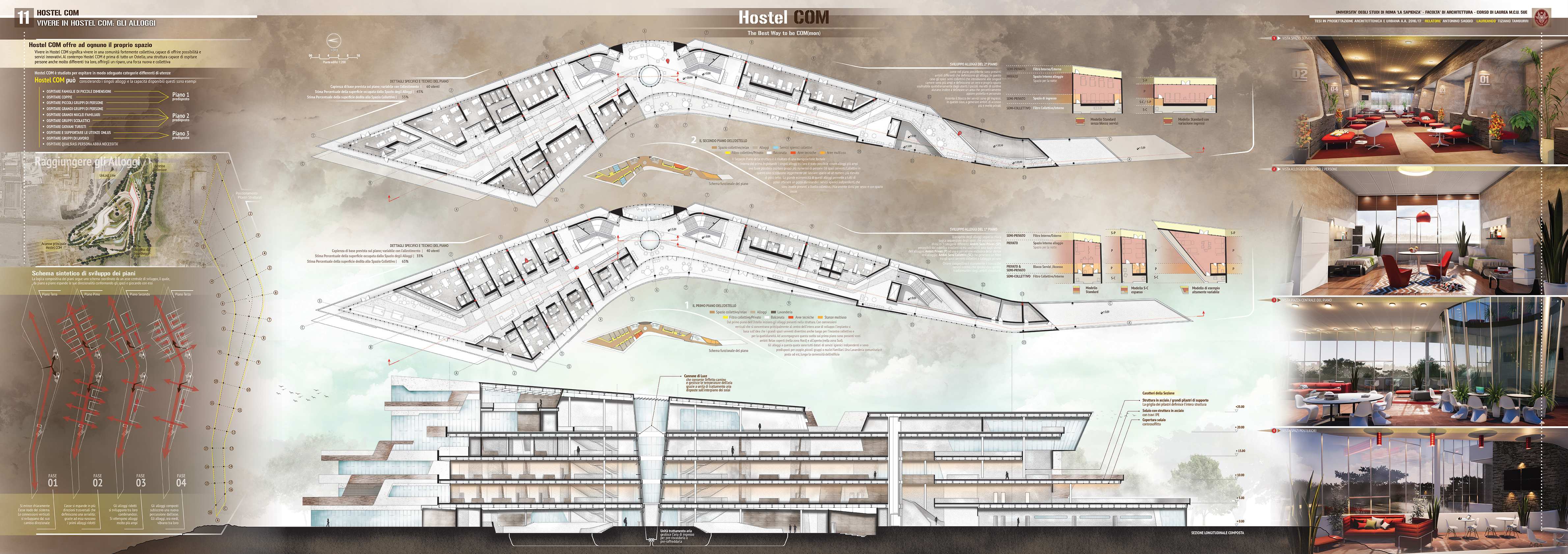 Hostel COM affronta l’assenza di luoghi aggregativi attraverso la sua funzione principale che è quella di realizzare un ostello comunitario che risponda alla domanda dei molti visitatori giovani di Roma con alloggi economici, sicuri e multifunzionali. Il progetto di conseguenza propone una vasta serie di tipologie abitative che vanno dalle camere per coppie, a quelle per piccoli o grandi gruppi o a soluzioni per residenze lavoro prolungate. Questi alloggi sono pensati insieme a spazi di mediazione e condivisione di natura semi collettiva ai diversi piani dell'ostello.