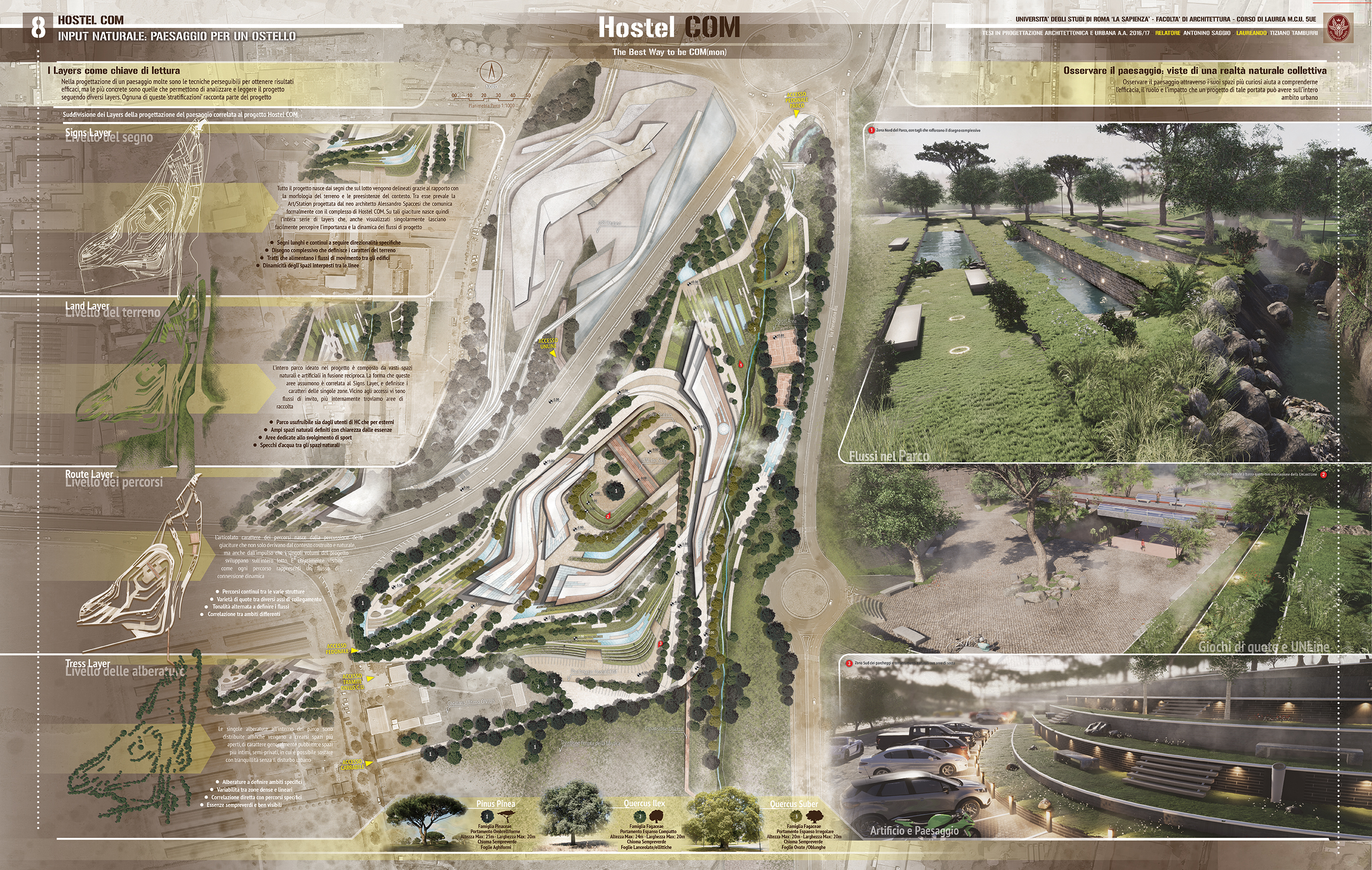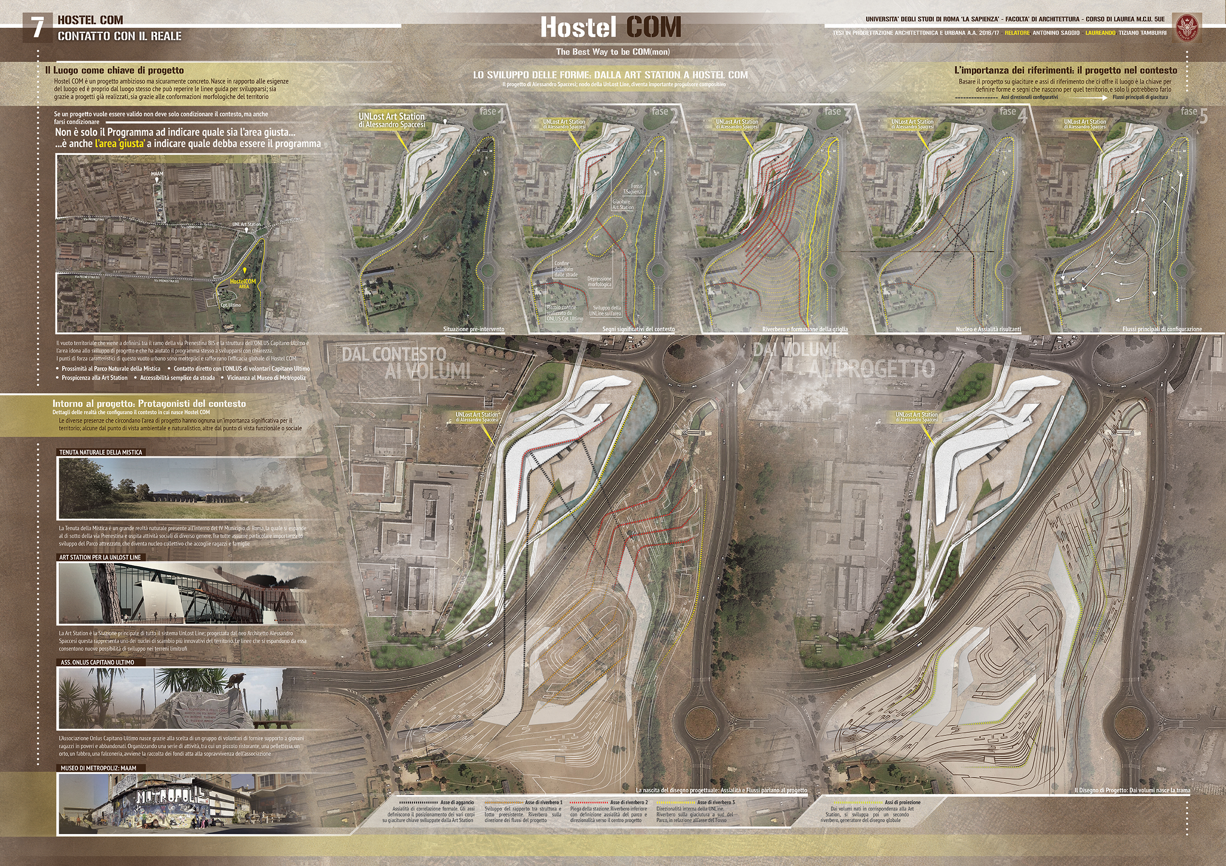 Hostel com è strettamente correlato anche fisicamente al contesto in cui nasce e cerca di risolverne parte delle crisi attraverso la propria morfologia che interpreta e trasforma giaciture, percorsi e preesistenze, con nuovi raccordi e penetrazioni. Posizionato in un’area definita dagli assi stradali della Prenestina Bis, a contatto diretto dell’Onlus Capitano Ultimo e di fronte all'Art Station per l’UNLost Line (progettata dall’architetto Alessandro Spaccesi), il complesso si configura con un disegno che parte dalle depressioni del terreno e comunica in modo molto forte con le preesistenze architettoniche.