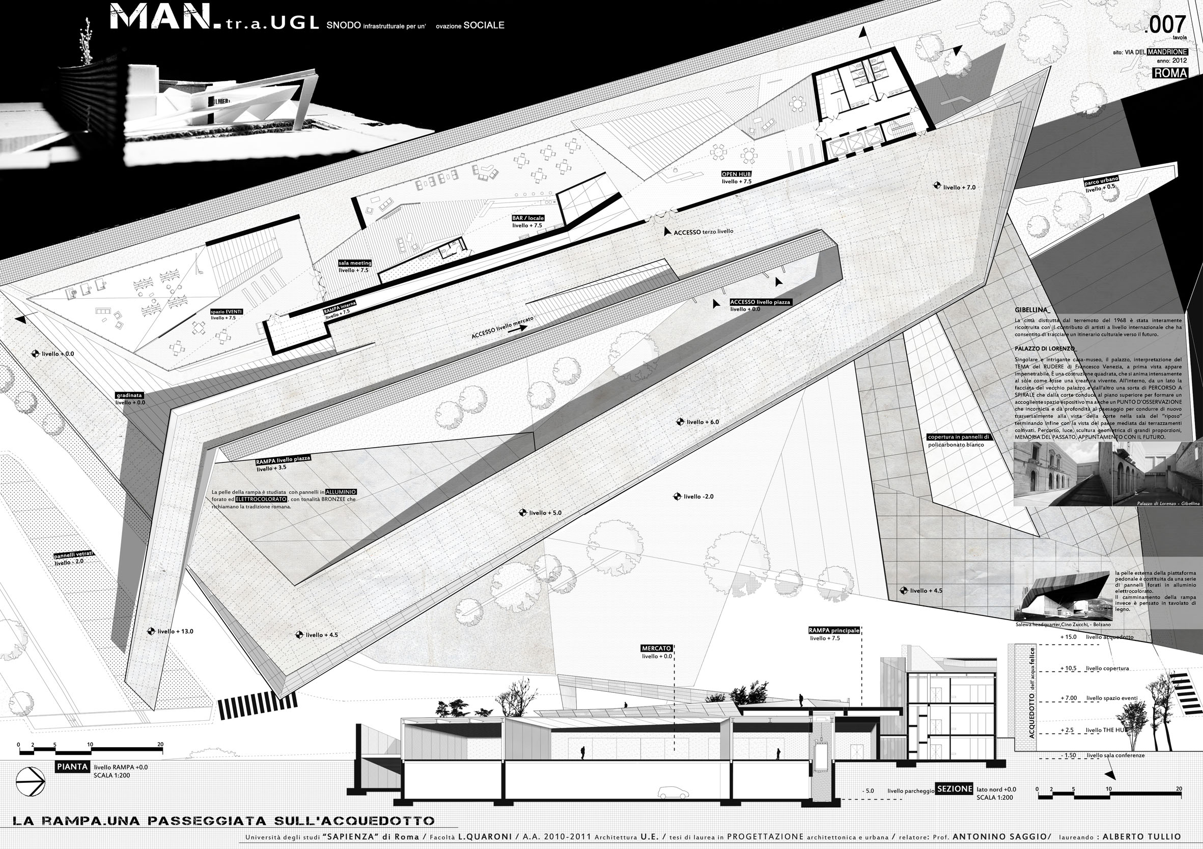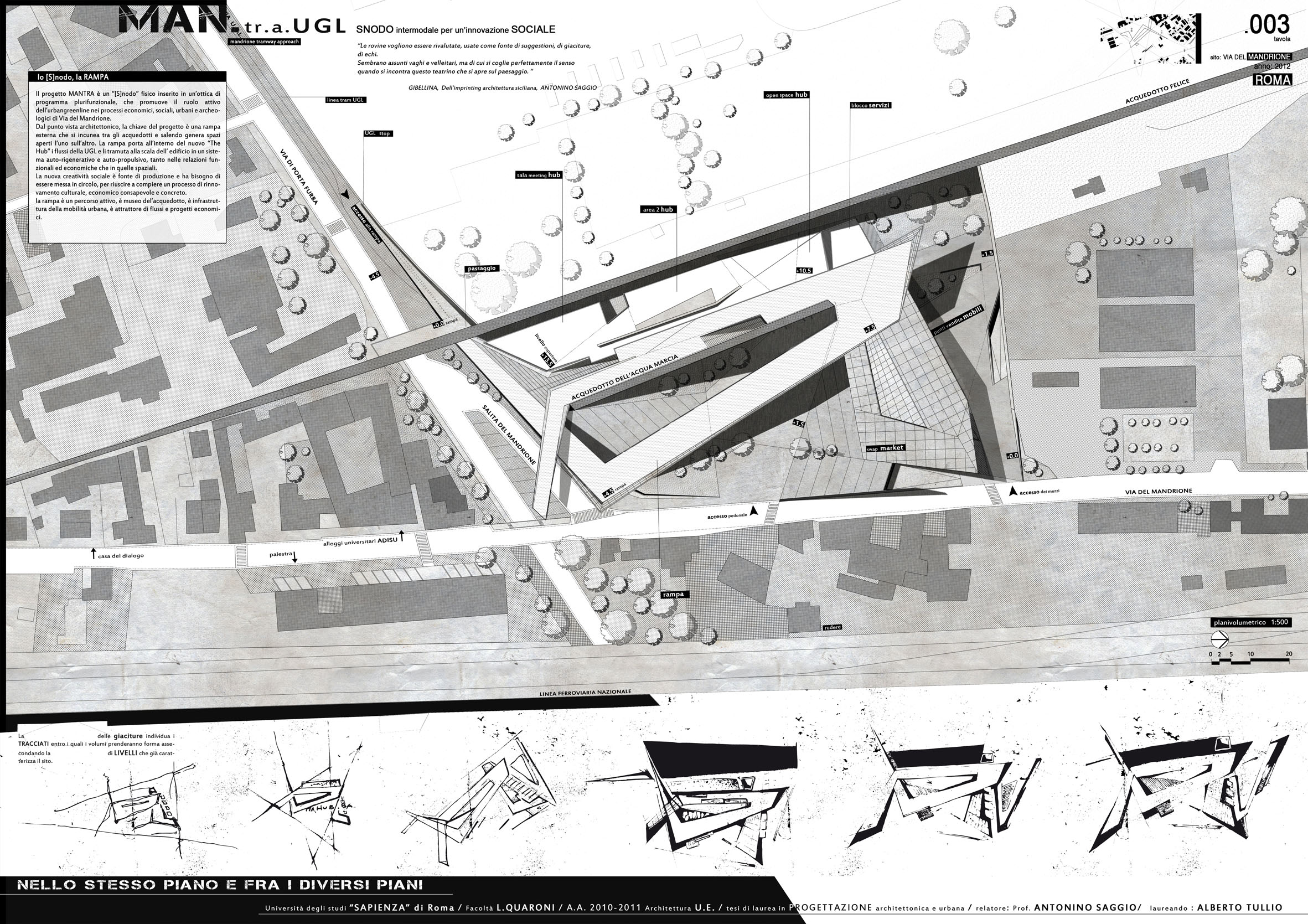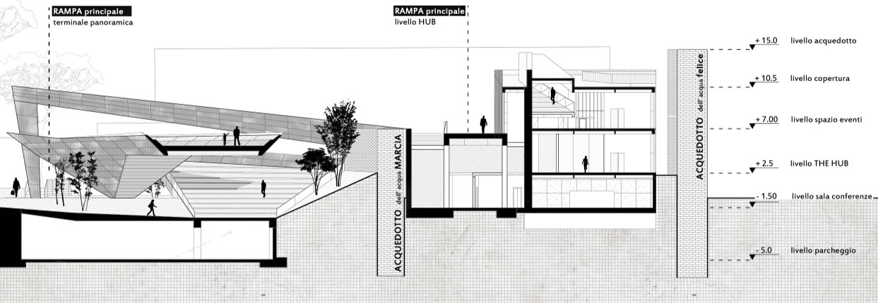 Dal punto di vista architettonico, il progetto insinua una rampa che dalla fermata della Ugl e del limitrofo museo del Neo realismo salendo consente l'arrivo in quota e poi la discesa alla piazza centrale del progetto. Una discesa che disimpegnando i vari spazi alle diverse quote e circondandoli con la rampa avvolge anche un pezzo di acquedotto preesistente. Gli spazi aperti e chiusi sono sagomati dinamicamente ed interconnessi tra loro, e il progetto ottimizza il complesso intreccio di funzioni che ospita con efficacia distributiva organizzatriva e con interesse spaziale e plastico rivolto alle rlazioni interno - esterno nuov progetto e preesistenze.