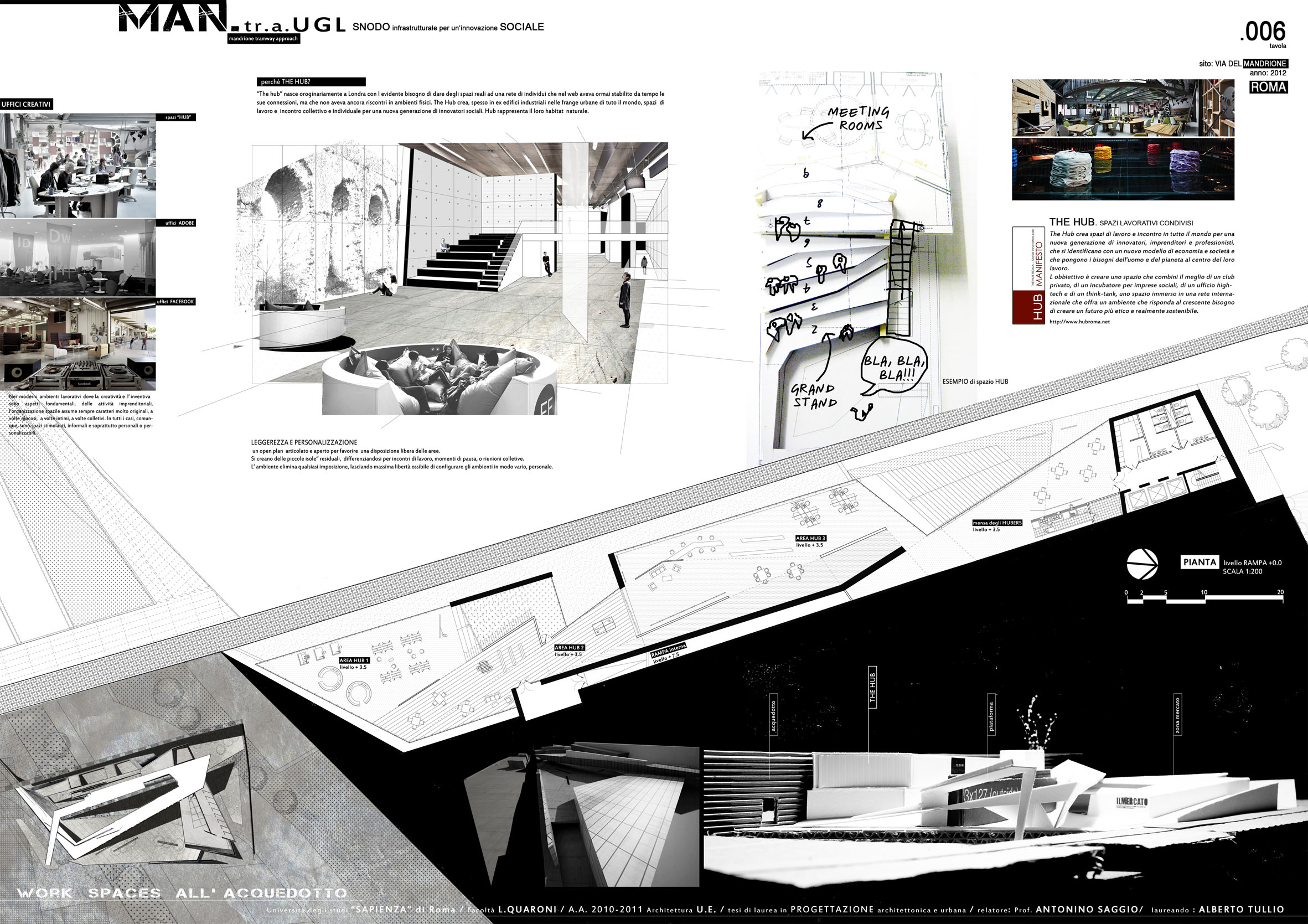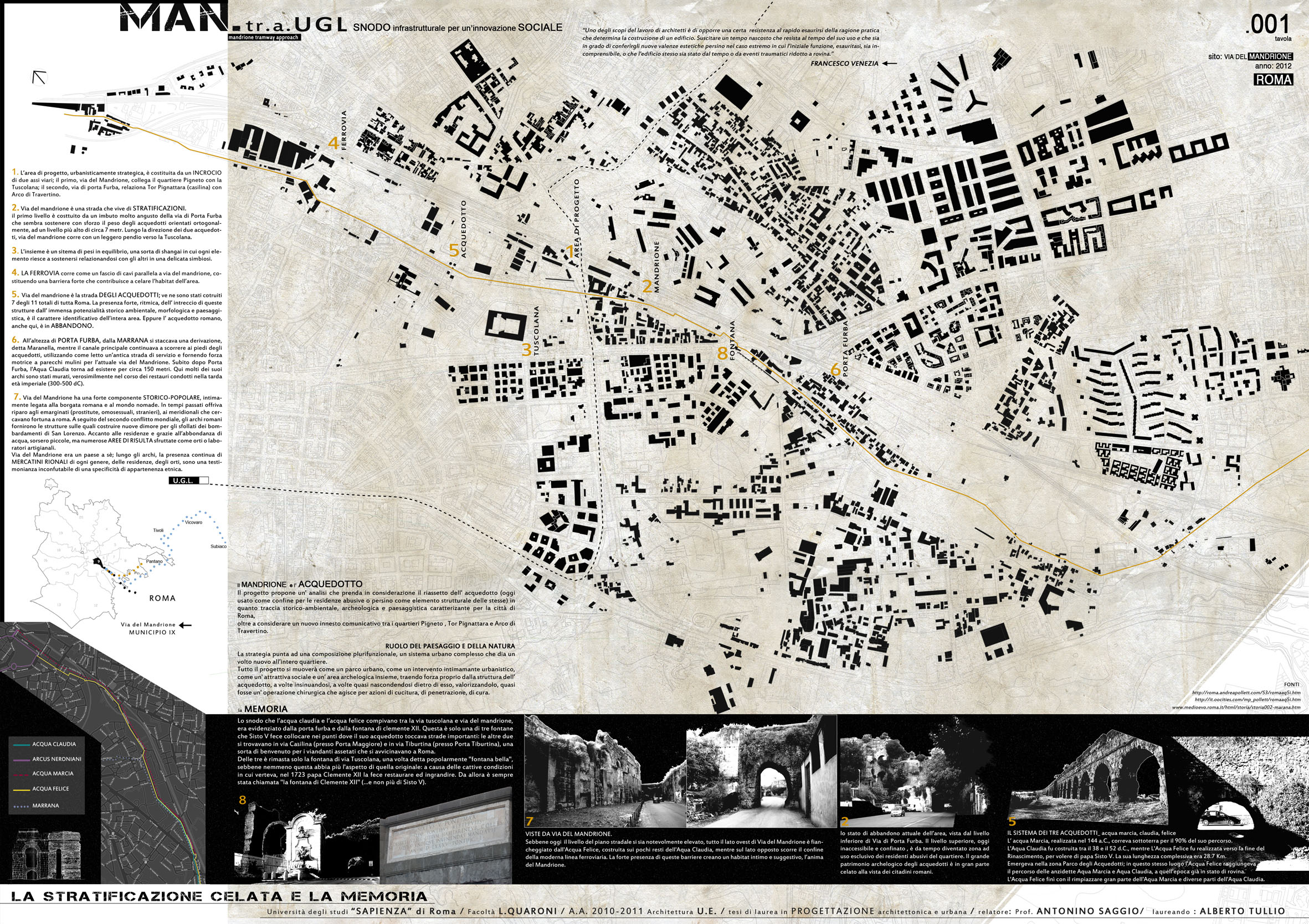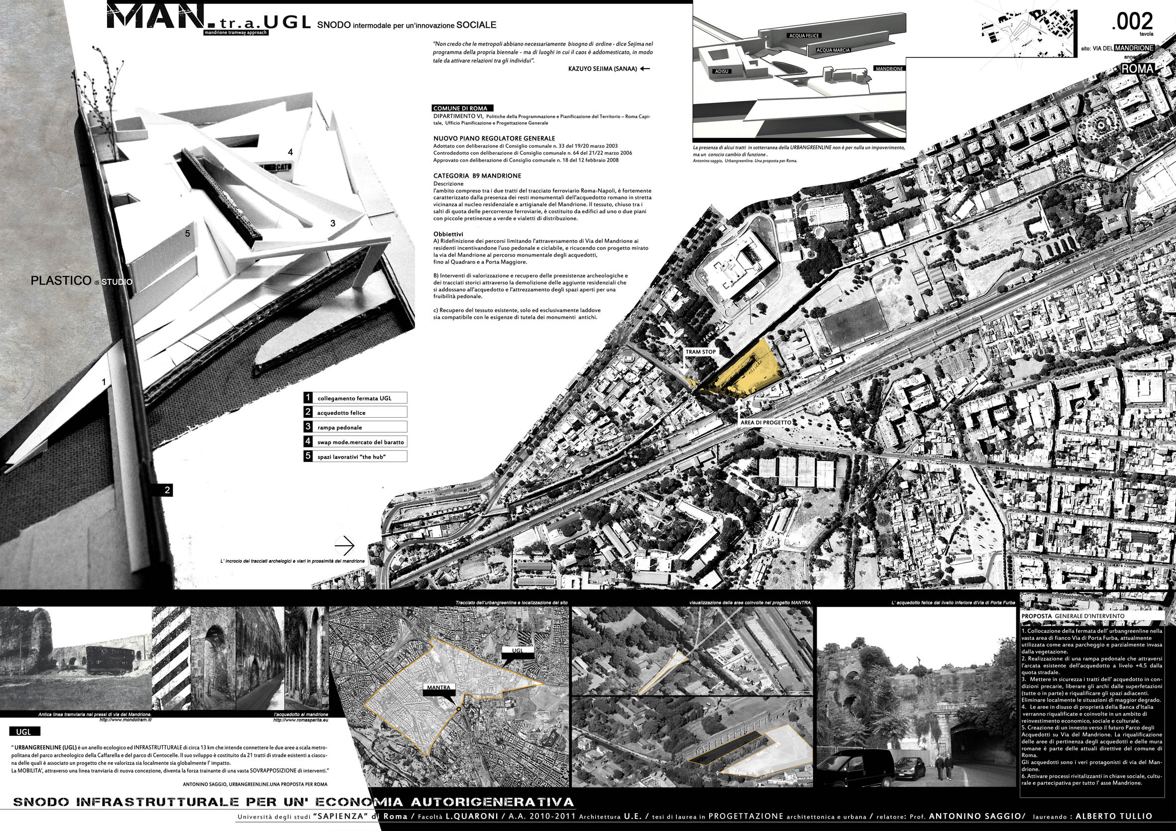 Dal punto di vista architettonico, il progetto insinua una rampa che dalla fermata della Ugl e del limitrofo museo del Neo realismo salendo consente l'arrivo in quota e poi la discesa alla piazza centrale del progetto. Una discesa che disimpegnando i vari spazi alle diverse quote e circondandoli con la rampa avvolge anche un pezzo di acquedotto preesistente. Gli spazi aperti e chiusi sono sagomati dinamicamente ed interconnessi tra loro, e il progetto ottimizza il complesso intreccio di funzioni che ospita con efficacia distributiva organizzatriva e con interesse spaziale e plastico rivolto alle rlazioni interno - esterno nuov progetto e preesistenze.