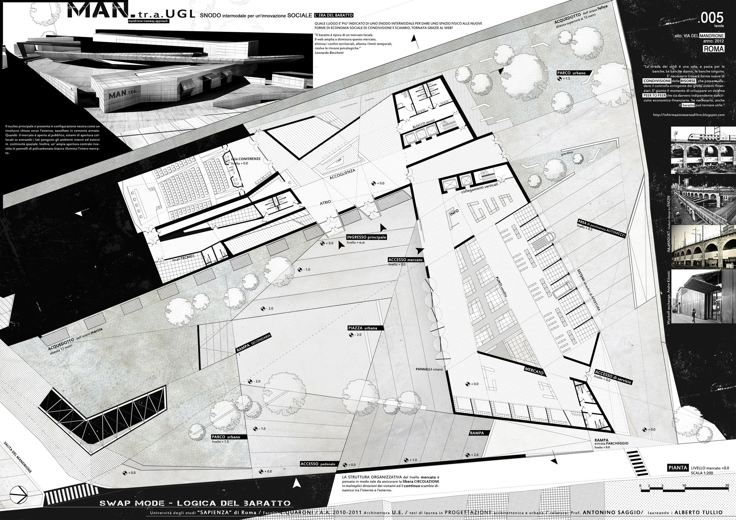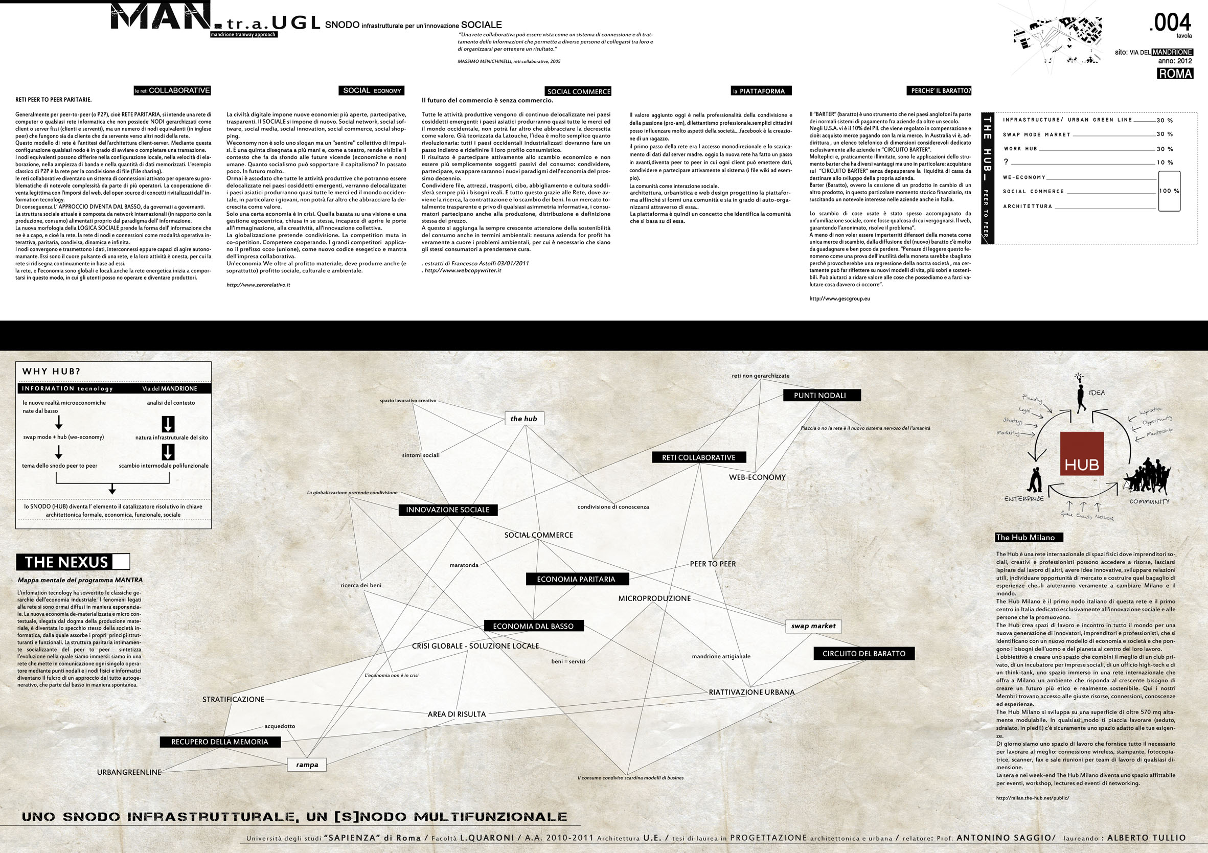 Mantra è un progetto che sceglie una delle aree più intricate e difficili all'interno della Urban Green Line, quella del Mandrione di Roma. In questa area si sovrappongono i tracciati di quattro acquedotti e di due arterie di scorrimento. Una intersezione particolarmente complessa e oggi inutilizzata viene scelta per inventare un programma tutto "site specific". E' quello del mercato dello scambio e del baratto e per innestarvi allo stesso tempo una funzione emergente nel contesto delle aree ex industriali delle grandi città, il co-working: un contesto operativo nel quale giovani imprenditori e creativi condividono spazi, strutture e macchinari. In questo contesto viene anche individuato un cliente possibile per il progetto nella organizzazione The hub che opera internazionalmente in questa direzione.