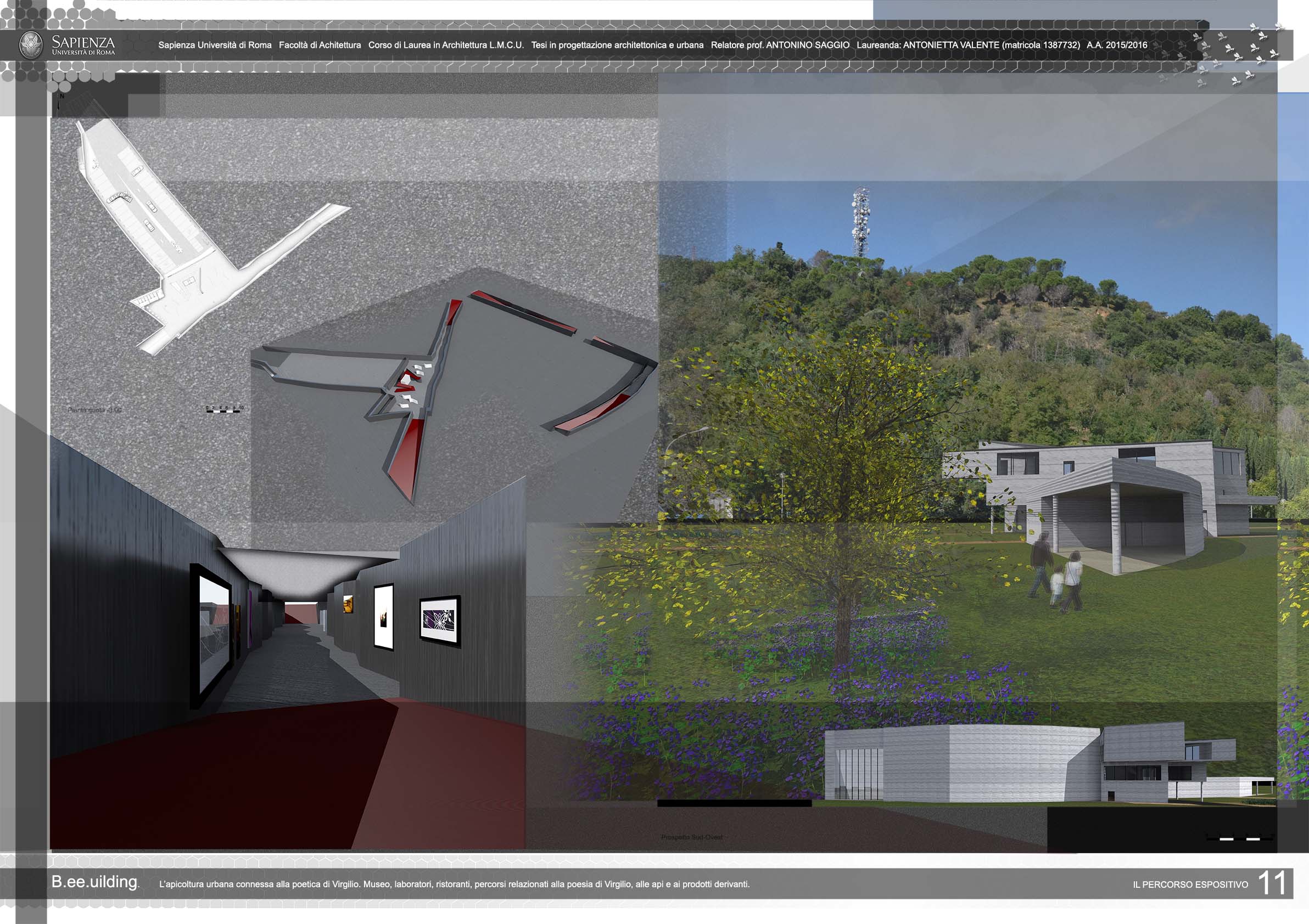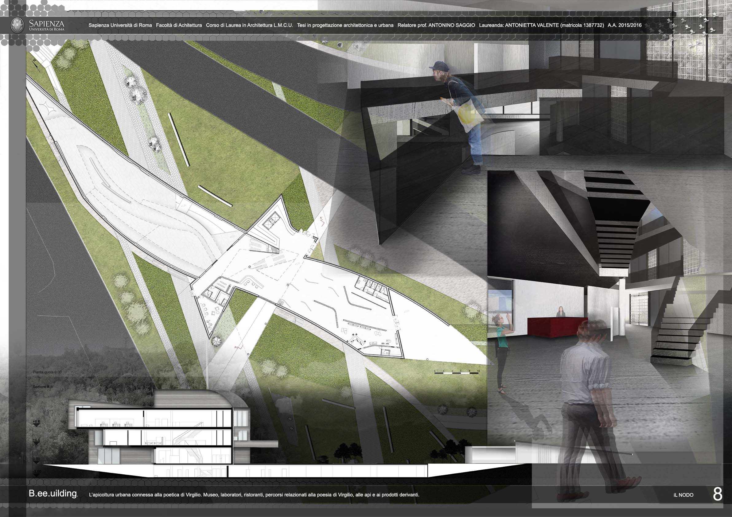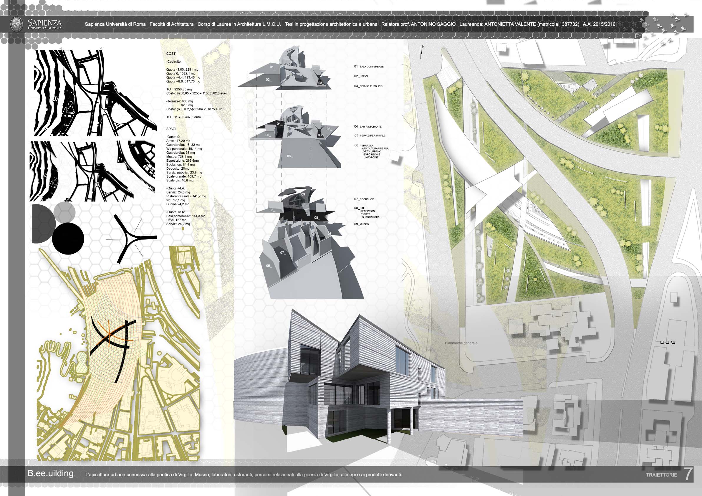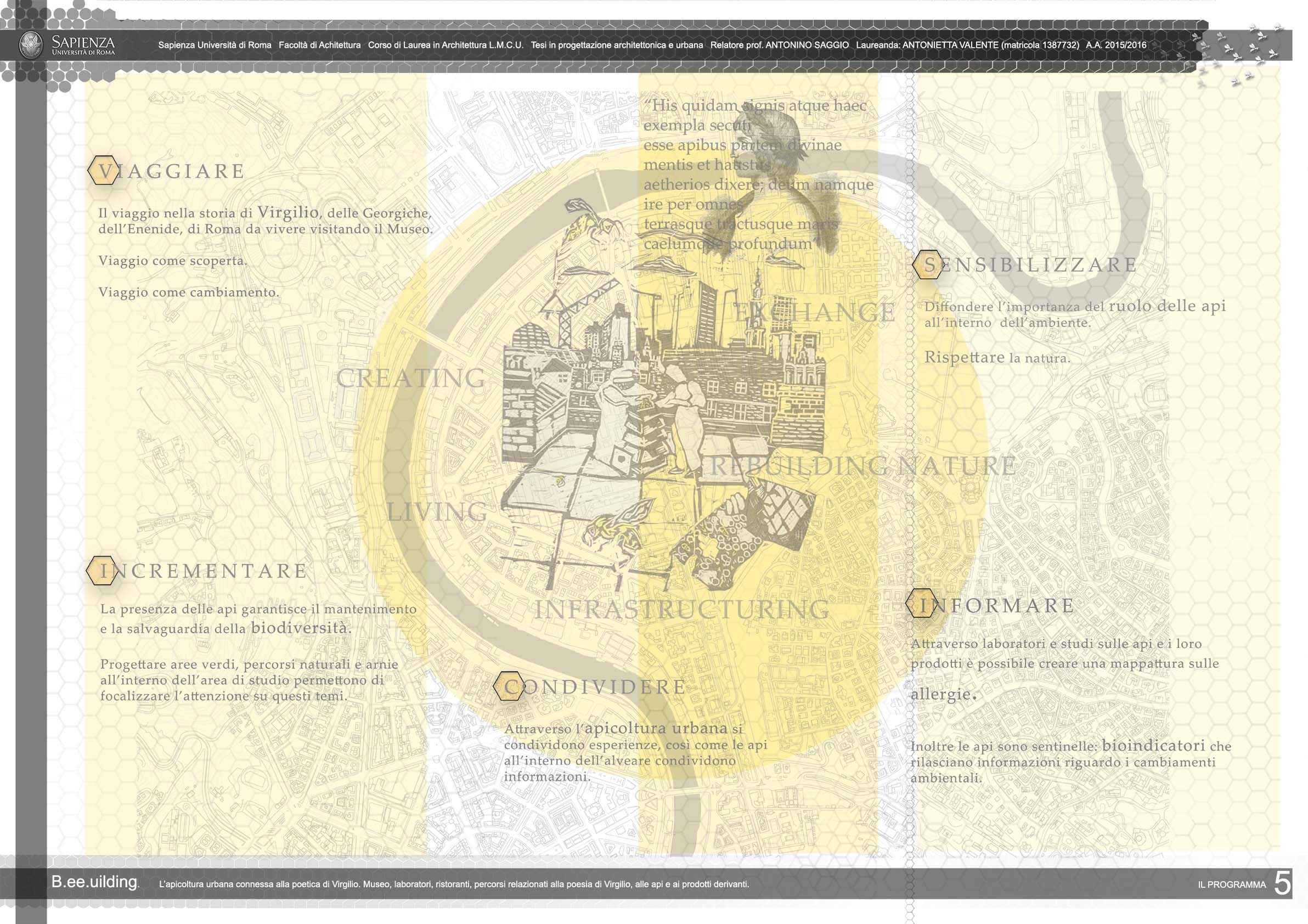 Il progetto si insedia in una area marginale, in una intersezione tra la collina di Monte Mario, l’inizio di Viale Angelico, il Tevere e il complesso di case popolari di Piazza maresciallo Giardino. Analizzando questa intersezione urbana, si è contemporaneamente riflettuto sul ruolo odierno delle api che, sempre più sospinte dall’uso dei pesticidi agricoli, si muovono in città. Allo stesso tempo, lo sviluppo dell’apicoltura urbana sta avendo uno sviluppo sensibile in diverse situazioni. Nasce di conseguenza l’idea di ideare un progetto che si incentri in questa attività. Approfondendo lo studio sulle api e sulle diverse componenti naturali e letterarie legate a questo insetto si è individuato nel poema del grande poeta latino Virgilio un importante precedente. Si è anche scoperto che in Italia vi è solo un museo dedicato al poeta latino e nessuno a Roma. Da questo intreccio nasce il programma del progetto. Un museo dedicato al poeta Virgilio ed in particolare all’Eneide e alle Georgiche e contemporaneamente all’apicoltura urbana. La localizzazione nei pressi del fiume Tevere sembra più che appropriata anche perche Enea arrivò a Roma risalendo il suo fiume.