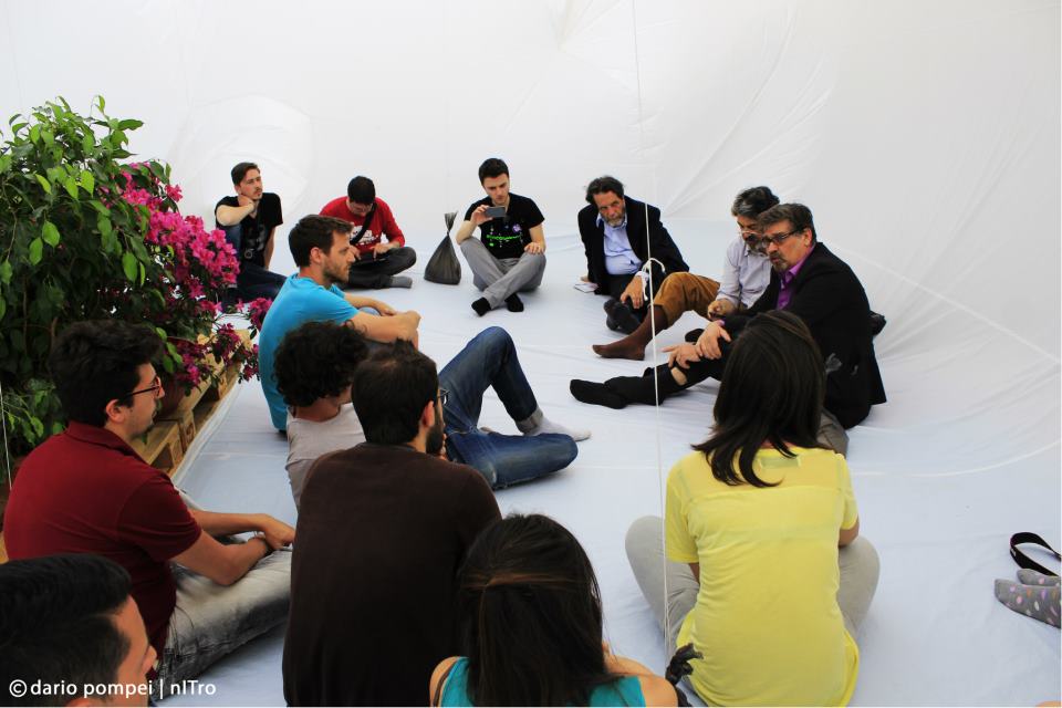DiAria – Temporary Air Farm è un padiglione gonfiabile itinerante, in grado di ripulire l’aria inquinata attraverso un micro-giardino collocato al proprio interno. Una struttura gonfiabile interattiva che assorbe CO2 e rimanda ossigeno e, respirando, si muove come un polmone grazie all’utilizzo della tecnologia elettronica Arduino.