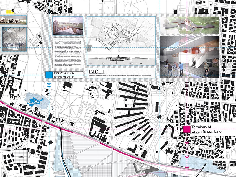 The UGL defines an urban strategy on the macro scale, by developing periphery-periphery horizontal systems, by connecting crosswise two large green wedges: the Centocelle park and the Caffarella park, by creating a system that merges together mobility, archaeological valorization, fruition and continuity between natural systems. Furthermore the UGL develops at the micro-scale projects bordering and interrelated (urban voids) among them, connected together by the urban planning, functional and morphological point of view. The way they grow is incremental. Each project becomes a previous context for the next one, by affecting it in all its aspects.