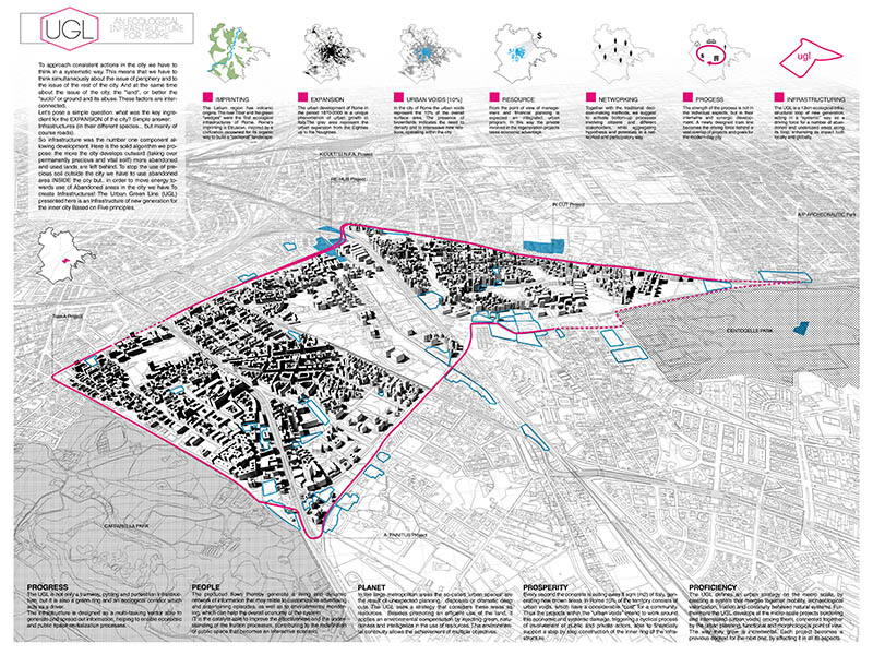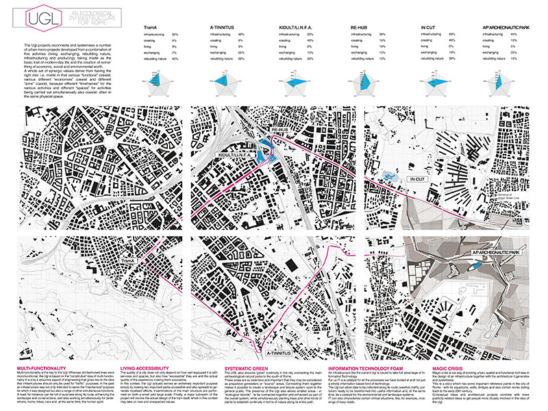 UGL is an ecological infrastructure of new generation for the city of Rome.The project adopts a systematic way of promoting the development and the reuse of several urban voids in the southern area of the city. To stop the use of soil, in order to move energy towards the use of the abandoned areas inside the city, we have to create infrastructures!