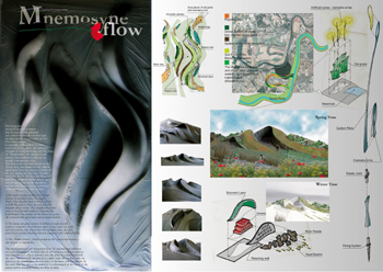 “The Stoneguard Phoenix Award”, è un Concorso Internazionale d’idee bandito dall’Association of Burial Authorities di Londra. Il Bando, chiedeva la progettazione di un cimitero pensato come un vero e proprio parco; un luogo, dove poter svolgere una serie di attività: dalla commemorazione dei defunti, alla semplice passeggiata, allo svolgimento di attività sportive e ludiche. Alla base del nostro progetto dal nome ” Menmosyne Flow ” c’è un vero e proprio progetto di paesaggio integrato, all’interno del quale s’intrecciano varie funzioni. Il bando, chiedeva la realizzazione di un cimitero pensato come un vero e proprio parco che comprendesse, oltre alla generale sistemazione del sito, la progettazione di luoghi per la commemorazione dei defunti: sepolti o cremati. Le cinque categorie previste dal bando, definivano più precisamente le richieste che, singolarmente o in modo sinergico dovevano contribuire alla elaborazione di modi innovativi di vivere il giardino-parco della memoria. Il progetto si presenta come un sistema di dune che con il loro andamento sinuoso definiscono una serie di ambiti, ora destinati alla commemorazione, ora veri e propri percorsi naturali inseriti nel verde. In questo contesto anche i profumi delle essenze arboree sono studiati per accogliere e guidare il visitatore. Alcune zone inoltre, si configurano come veri e propri sottosistemi dove un impianto di steli in materiale composito accoglie le urne cinerarie definendo ambiti più raccolti e riparati per la commemorazione dei defunti dopo la cremazione.