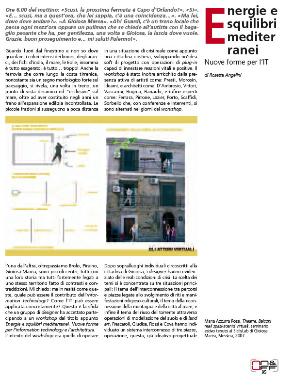 Antonino Saggio, direttore della collana IT Revolution in Architecture architetto e professore a La Sapienza di Roma, e il gruppo Nitro, che lavora progettualmente e pubblicisticamente nei rapporti tra IT e architettura, offrono il Secondo Workshop Siciliano a Gioiosa Marea, dal 31 agosto al 7 settembre 2008. Special Guest sarà Giovanni D’Ambrosio che seguirà come docente l’intero seminario apportando al lavoro il suo contributo di altissimo profilo nelle tematiche ambientali, comportamentali e nell’uso inventivo dei materiali semplici e quotidiani che derivano dalla sua esperienza nei paesi del lontano Oriente.