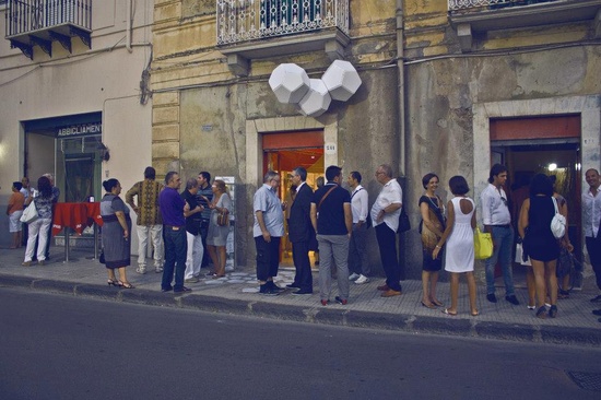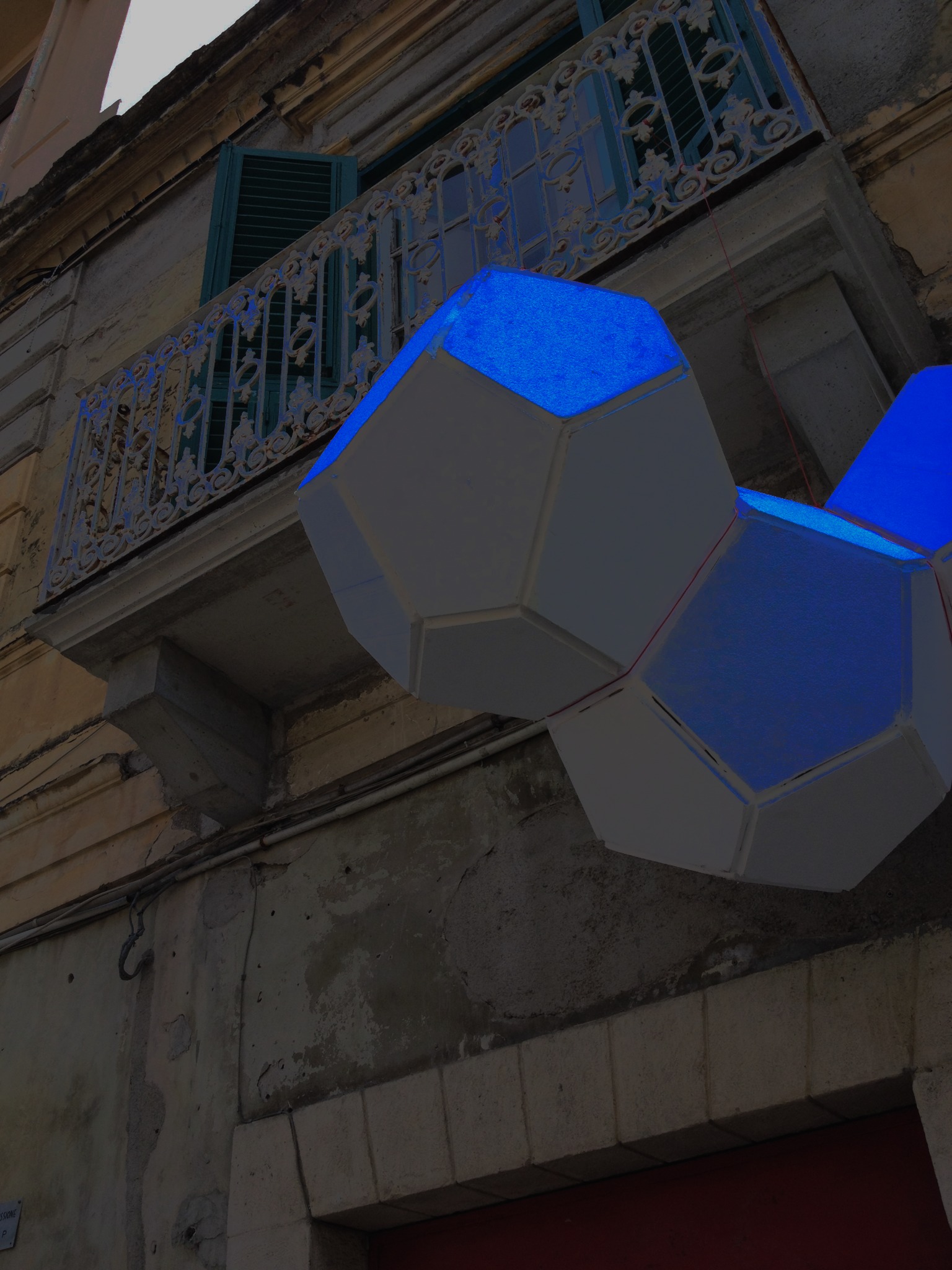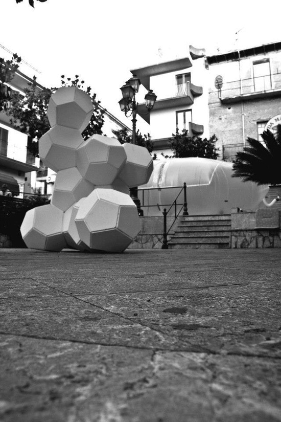 Photo-AC04B924-95DF-46C8-8E0D-37B467E28FFE-20120908-123228-2048 Una serie di elementi geometrici, progettati in un software parametrico e tagliati con macchina digitale sono stati ri-assemblati a Gioiosa Marea per formare una sorta di bolle informatiche che segnano alcune tappe del percorso espositivo. Le bolle diventano, all’interno dello spazio pubblico, degli elementi che fuoriescono dalla galleria, per segnalare l’evento al visitatore, e poi si raggrumano nella Piazza Mercato. L’idea nasce dal mare, dalla schiuma delle onde da cui TetraPlay riprende la struttura del singolo elemento e quindi aggregativa.