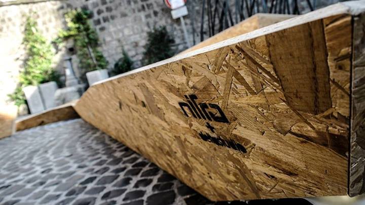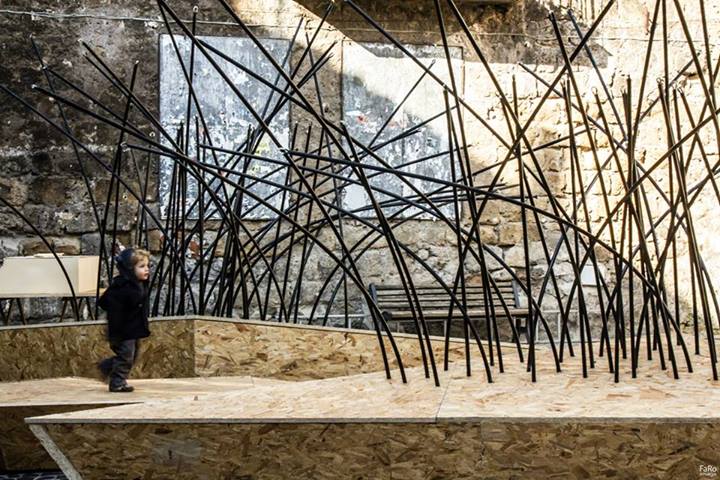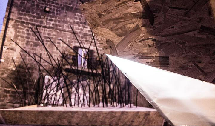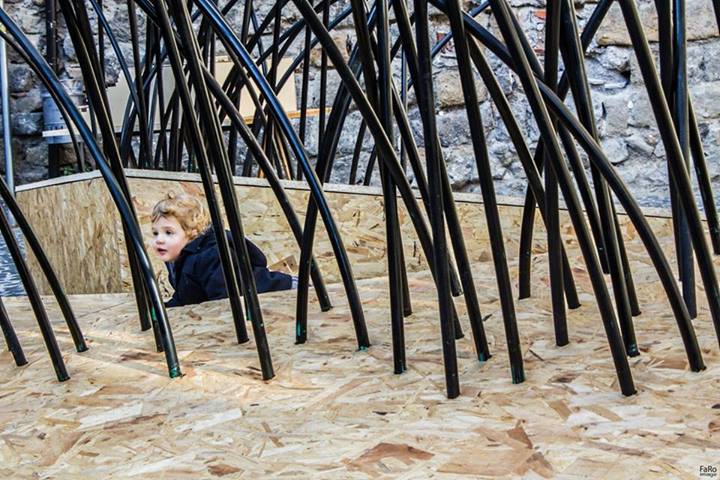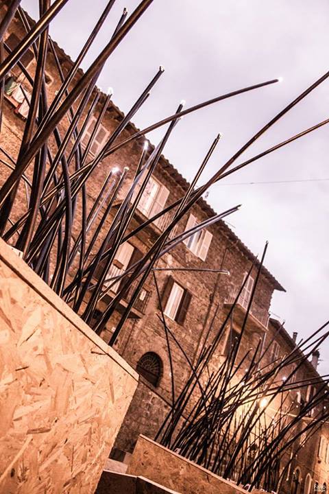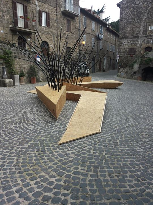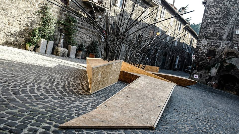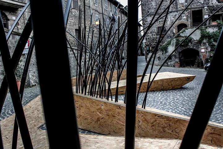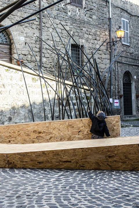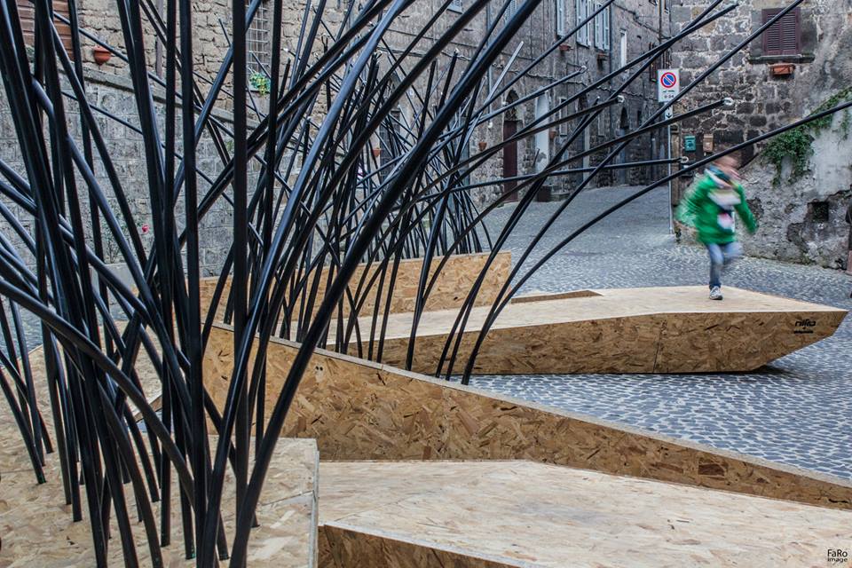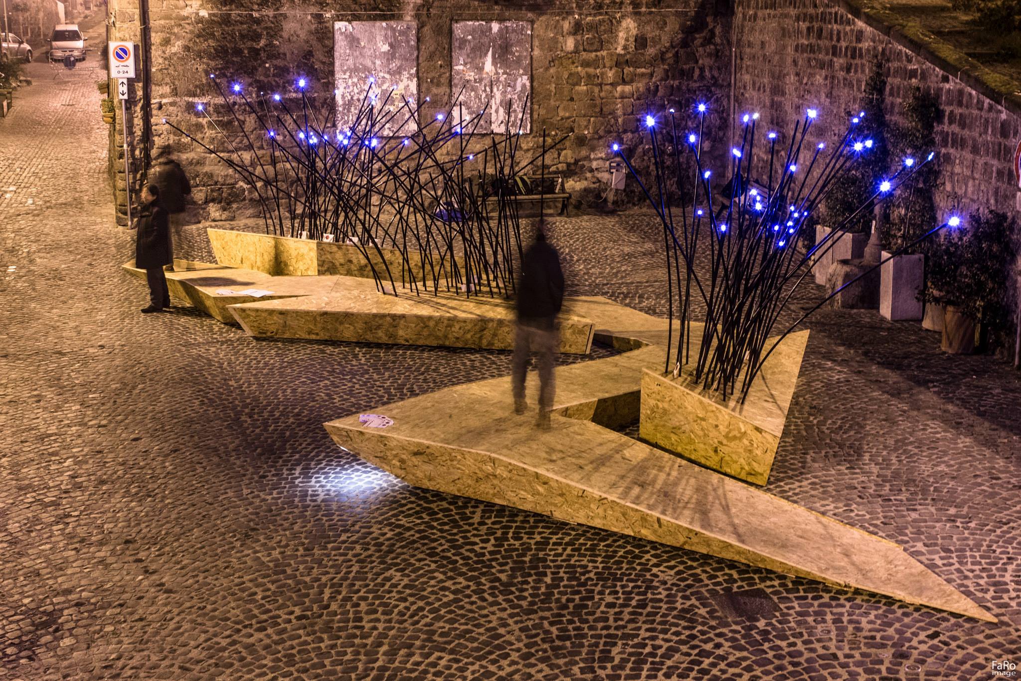 L’installazione nel centro storico di Ronciglione nella piazza degli Angeli, la prima che si incontra lungo il percorso di Via Tre Cannelle, costruisce una rampa passerella armoniosa e sfioccata in varie direzioni che dinamizza lo spazio e ne sottolinea le potenzialità.Lungo la rampa-passerella si realizzano più di cento alberi “sintetici”. Evocano l’operazione di progetto e allo stesso tempo rivelano che solo la presenza attiva della comunità può imporre una soluzione intelligente.