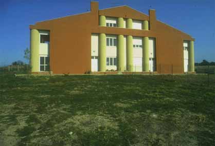 a unità volumetrica le due distinte entità funzionali e sviluppa uno schema di decisa simmetria bilaterale con un tetto a falda che