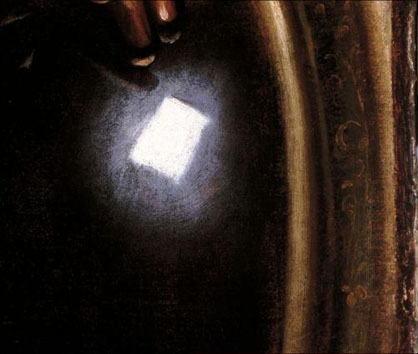 1993 ed è riportato in Robb 2001 p. 288) Lo specchio curvo è dipinto