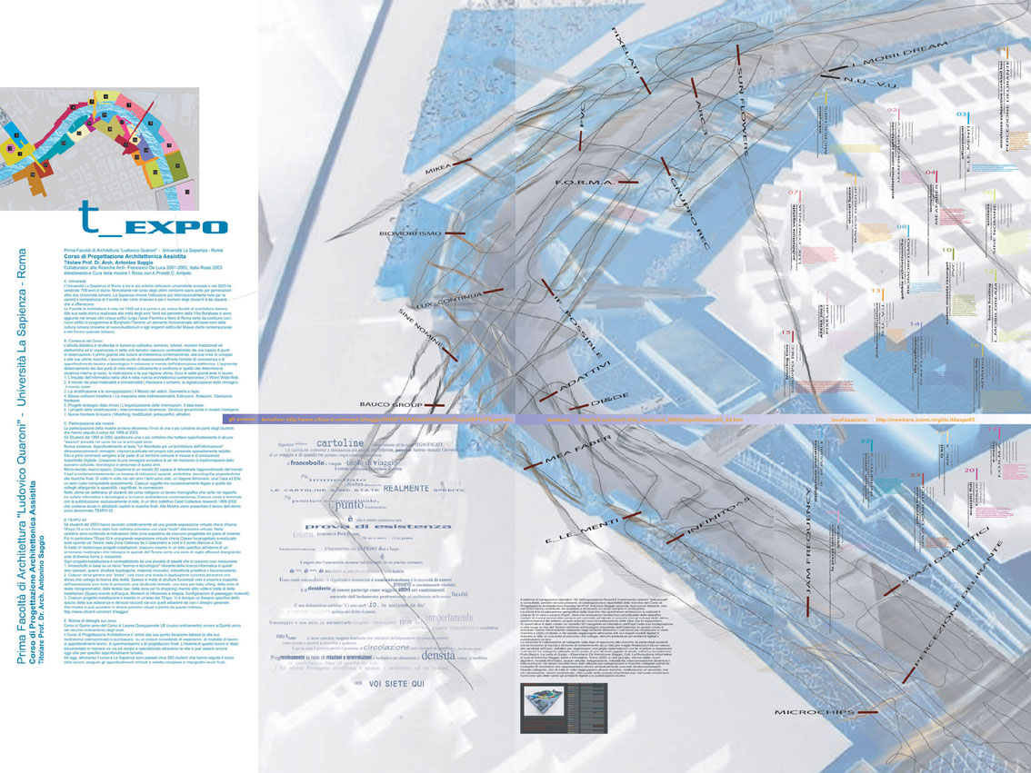 In questo contesto il Corso di Caad 2003 tenuto dal prof. Antonino Saggio (Facoltà di Architettura L. Quaroni, La Sapienza, Roma) ha presentato l'ultimo lavoro  prodotto. Si tratta di "Texpo 2003", un'esposizione virtuale sulle rive del Tevere nell'area dell'Ostiense. Nel contesto di un dettagliato master plan, Venticinque progetti installazioni indagano il tema del rapporto tra la tecnologia digitale e il progetto architettonico. Spesso si tratta della progettazione di strutture funzionali vere e proprio a supporto dell'esposizione (una torre di proiezioni, una strutturale termale, una zona per baby sitting) mentre altre volte si tratta di delle installazioni (Spazio evento sull'acqua, Momenti di riflessione e terapia, Configurazioni di paesaggio mutevoli).